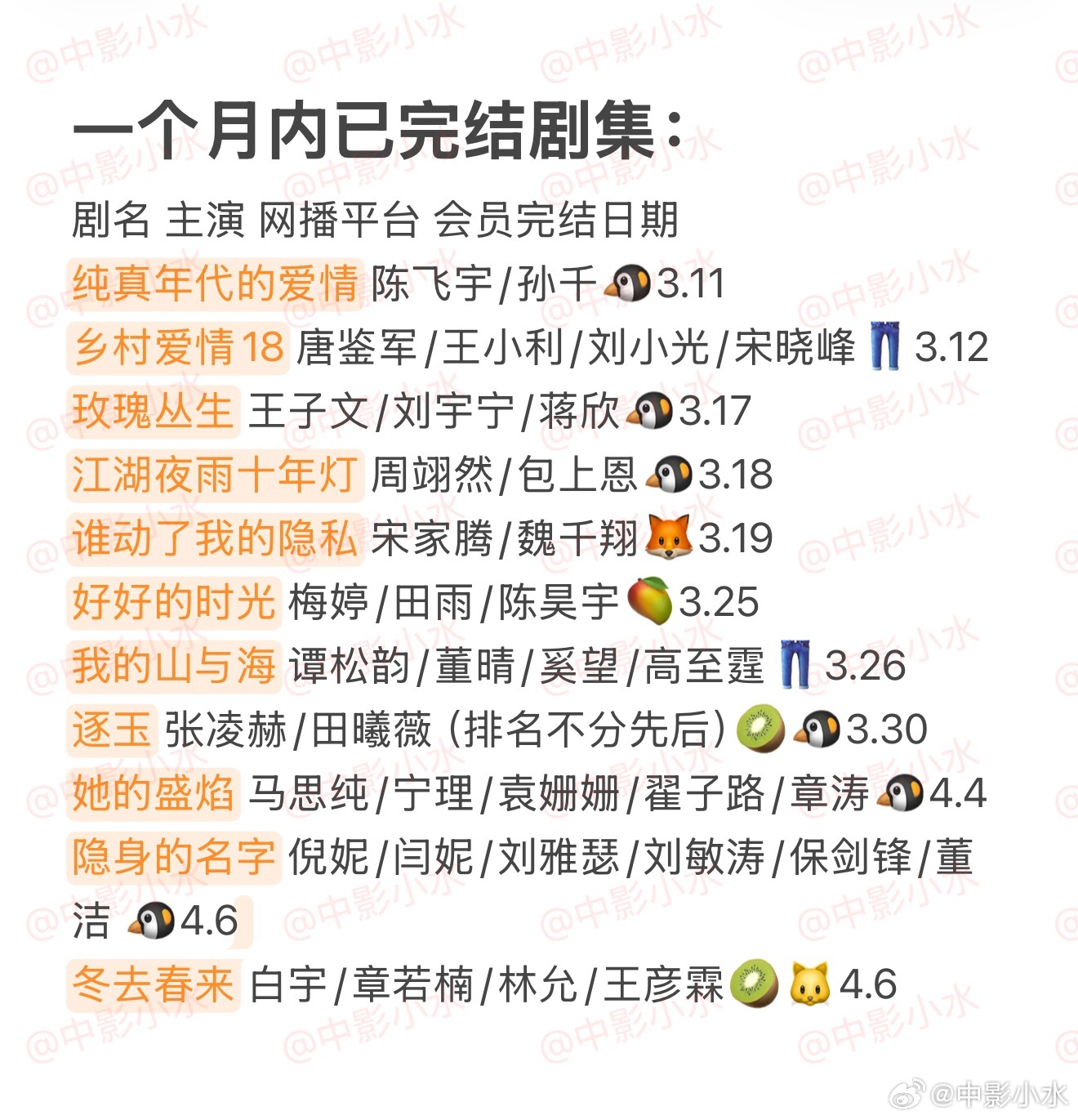 🈶正义女神 佘诗曼/谭耀文🈶你好1983 周也/翟潇闻 🈶白日提灯 迪丽热巴/陈飞宇🈶叵测 刘烨/聂远/王佳佳🈶月鳞绮纪 鞠婧祎/曾舜晞/陈都灵/田嘉瑞(排名不分先后)🈶钢铁森林 井柏然/蔡文静🈶🆕冰湖重生 李昀锐/黄杨钿甜