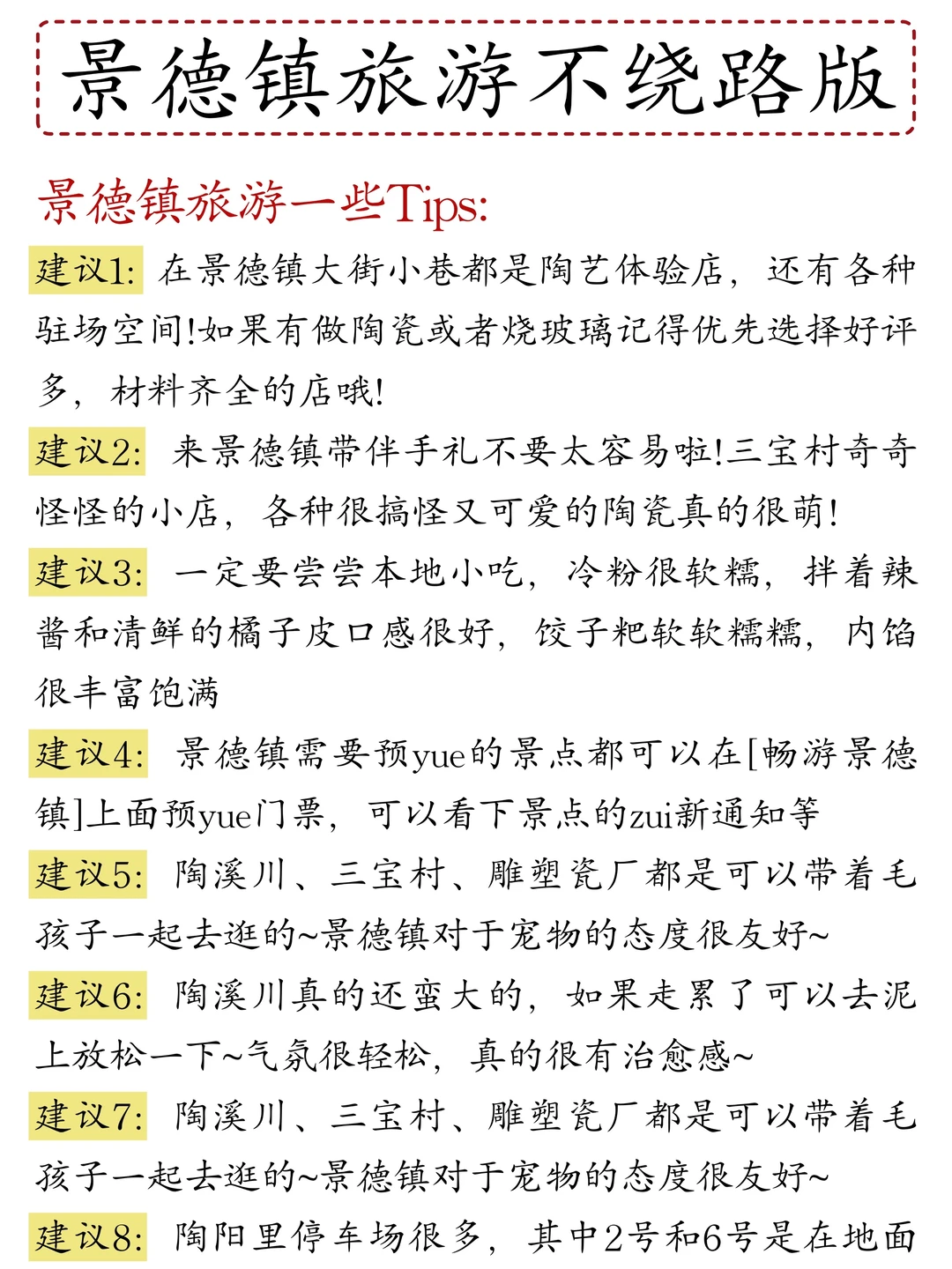 建议4:景德镇需要预yue的景点都可以在[畅游景德镇]上面预yue门票,可以看下景点的zui新通知等