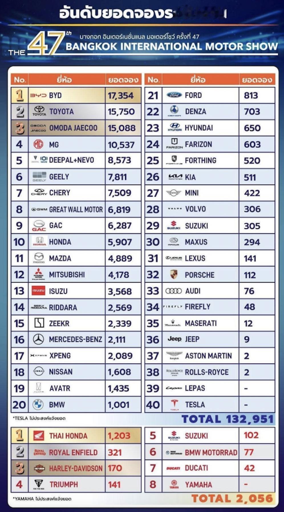 在刚刚结束的曼谷国际车展上,比亚迪简直大放异彩,彻底点燃全场热度!在这次车展上比亚迪包含腾势在内狂揽18057台订单(其中比亚迪品牌1.73万台),比排名第二的丰田整整领先0.16万台,实打实拿下了销量第一名宝座,用实力碾压全场,直接刷新了品牌记录。