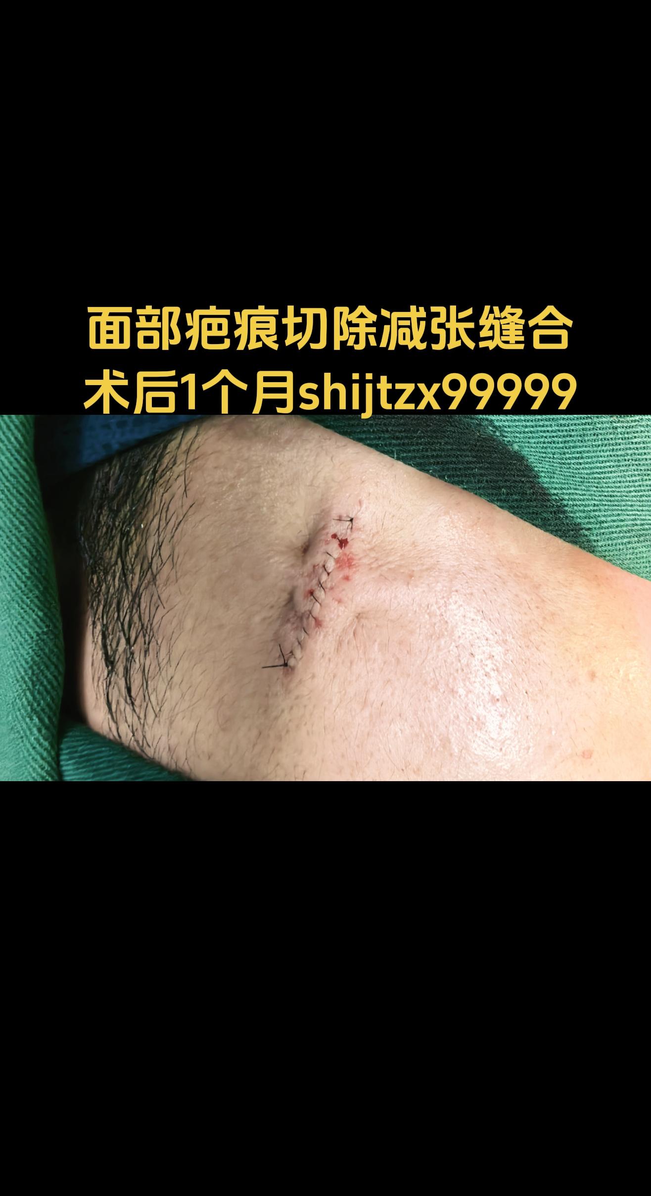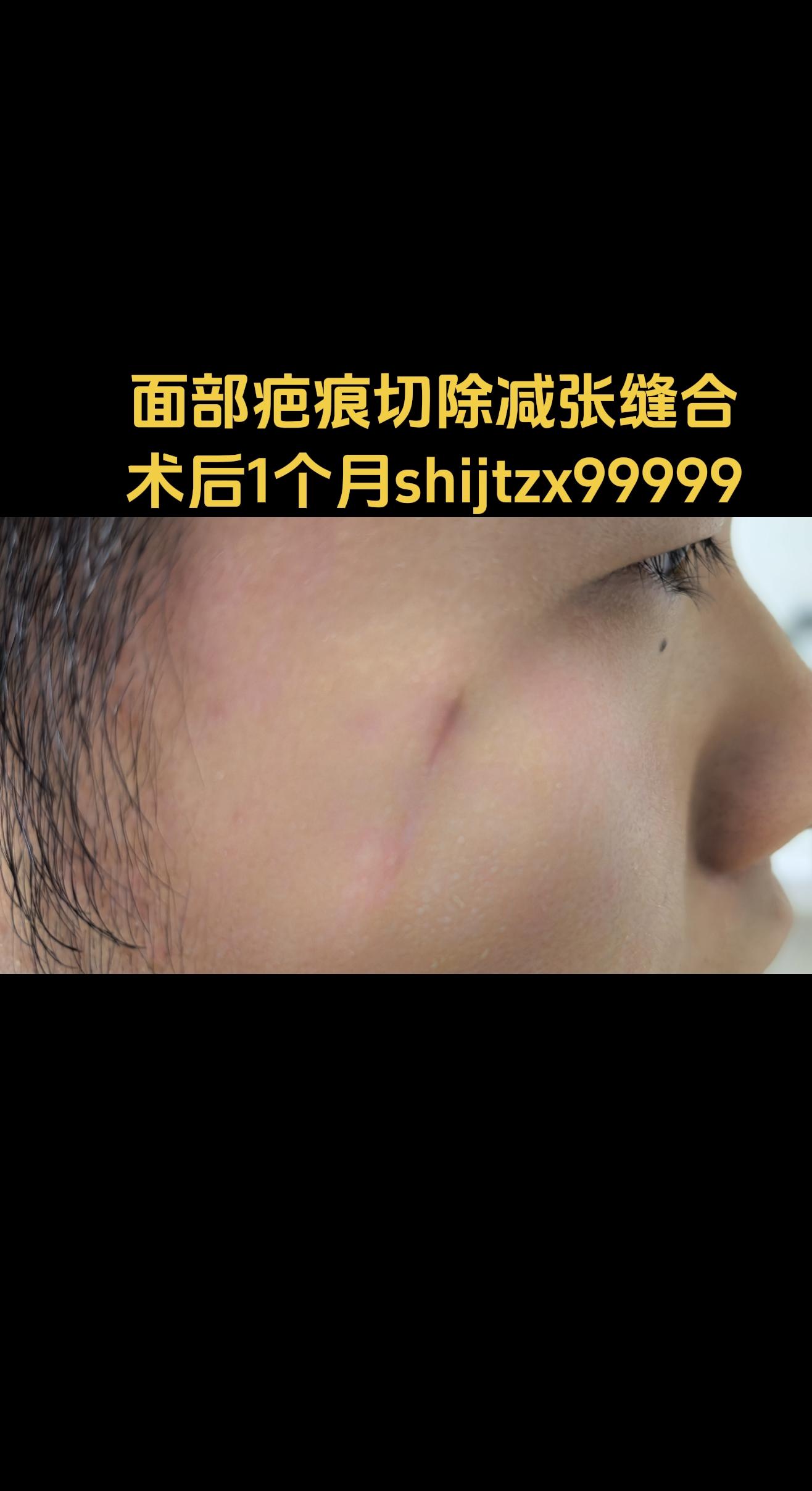 面部瘢痕。小时候面部“黑胎记”点痣后,留下瘢痕,采用整形切除适度减张缝合,术后抹抗疤药,贴减张贴护理。1个月半后复诊。