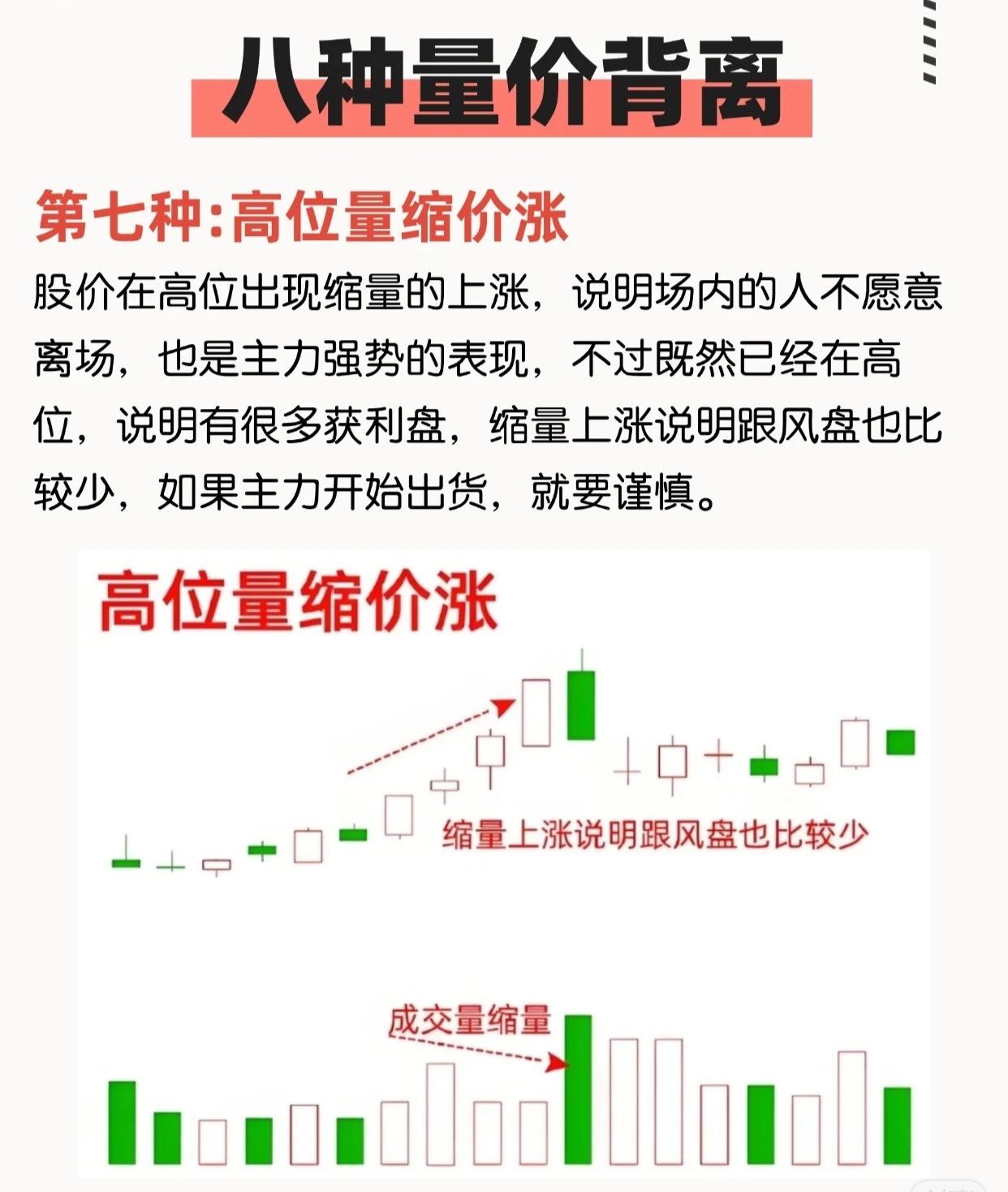 7. 高位量缩价涨·强弩之末股价高位,缩量上涨。场内人“不愿离场”(惜售),主力看似强势,但跟风盘极少(没人敢追高了)。→ 高位+缩量涨,是“危险信号”——一旦主力出货,股价易暴跌,谨慎持有。