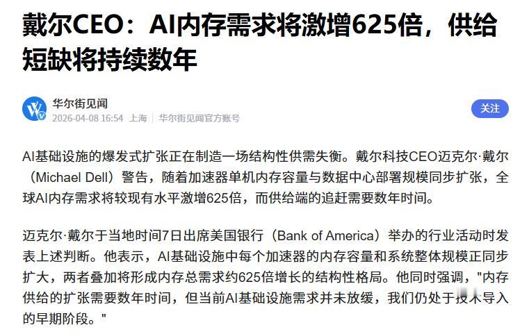 据了解,近日戴尔CEO迈克尔·戴尔在聊到“内存供需”这一话题时表示,受数据中心部署等因素的影响,在2028年,全球的AI内存需求将激增625倍。
