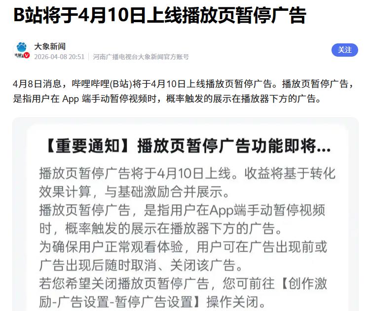 据媒体报道,哔哩哔哩(B站)将于4月10日上线播放页暂停广告。