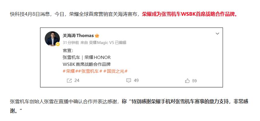 据媒体报道,在张雪机车赢得WSBK葡萄牙站量级比赛后,荣耀也将与张雪机车展开联名合作,成为其在WSBK后续赛事中的首席战略合作品牌。 事后,张雪本人也在直播中表示:“特别感谢荣耀手机对张雪机车赛事的鼎力支持,非常感谢。”