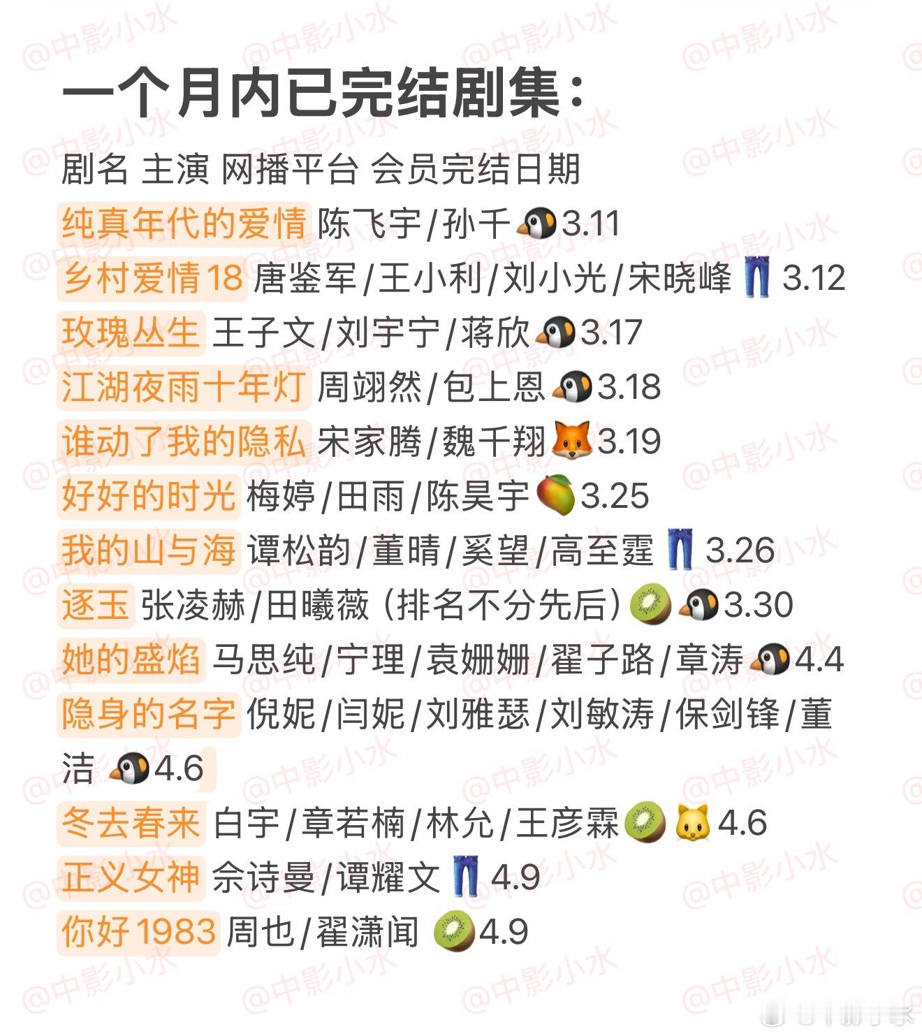 🈶正义女神 佘诗曼/谭耀文🈶你好1983 周也/翟潇闻 🈶白日提灯 迪丽热巴/陈飞宇🈶叵测 刘烨/聂远/王佳佳🈶月鳞绮纪 鞠婧祎/曾舜晞/陈都灵/田嘉瑞(排名不分先后)🈶钢铁森林 井柏然/蔡文静🈶冰湖重生 李昀锐/黄杨钿甜