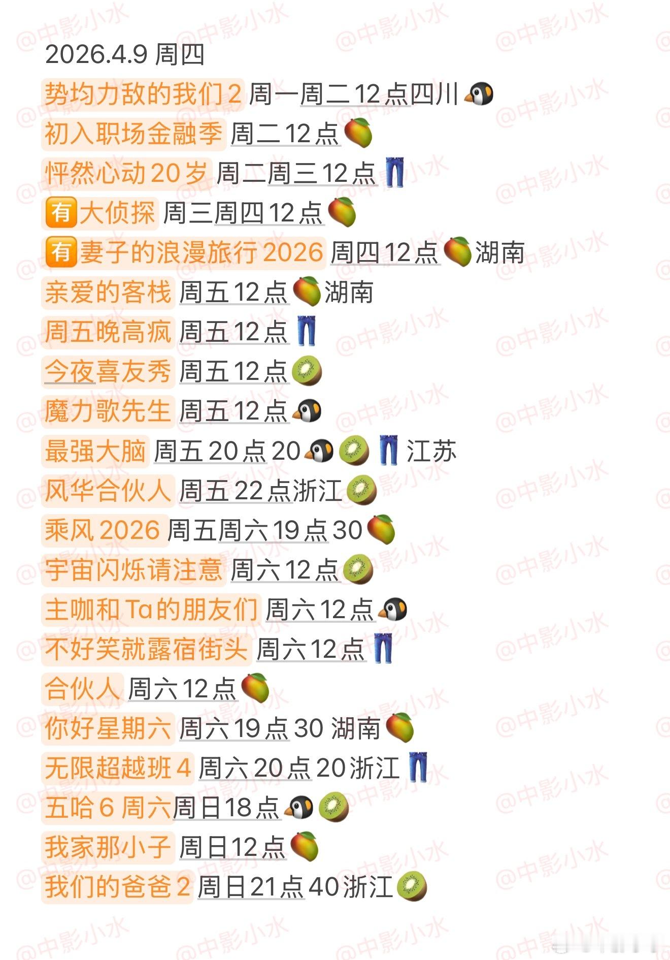 拯救剧荒 4月9日,今晚看点啥??图1 追剧日历 图2 综艺日历 图3 已完结剧集 🈶你是迟来的欢喜 魏哲鸣/郑合惠子🈶危险关系 孙俪/吴慷仁🈶八千里路云和月 王阳/万茜/黄澄澄