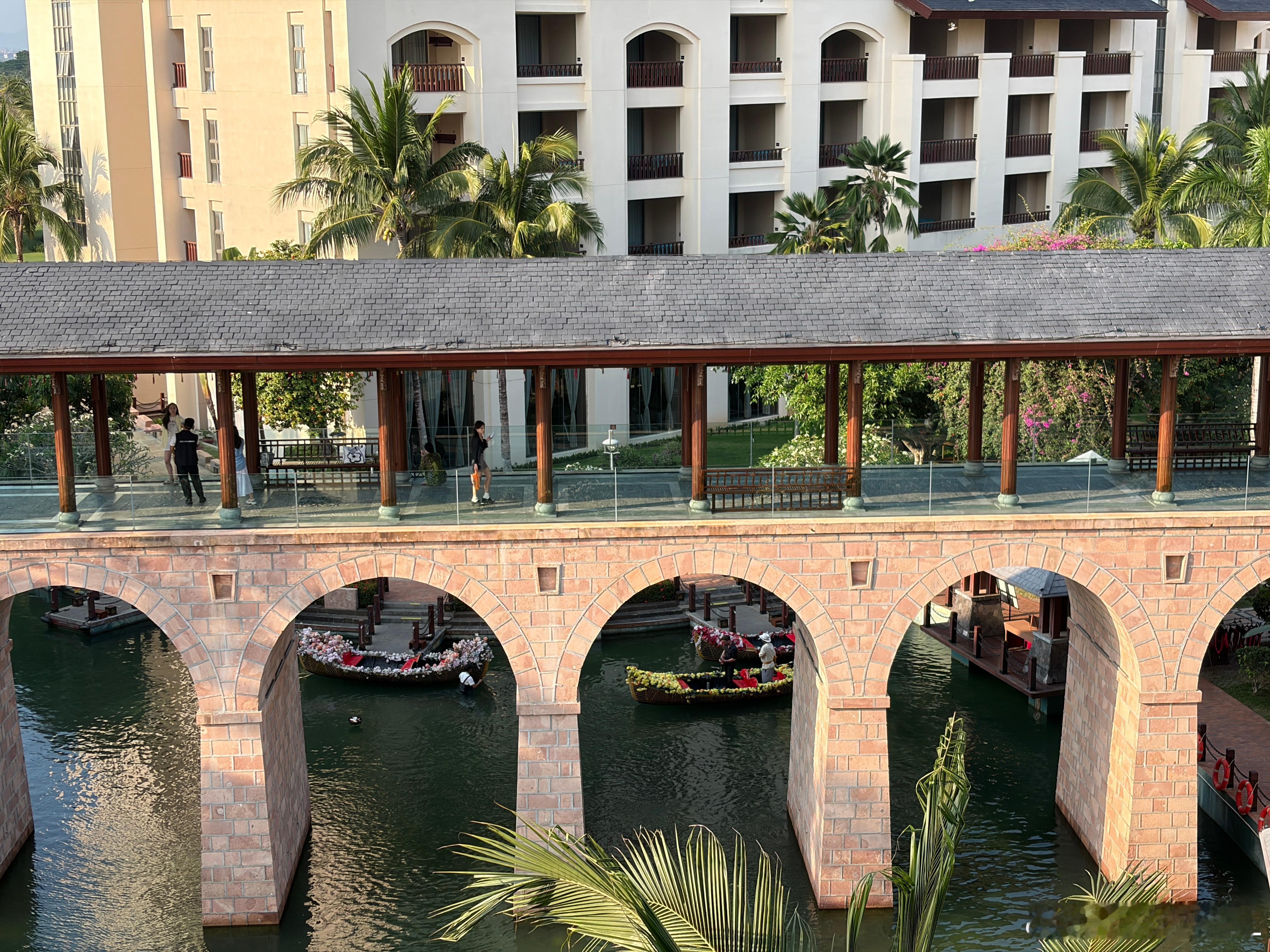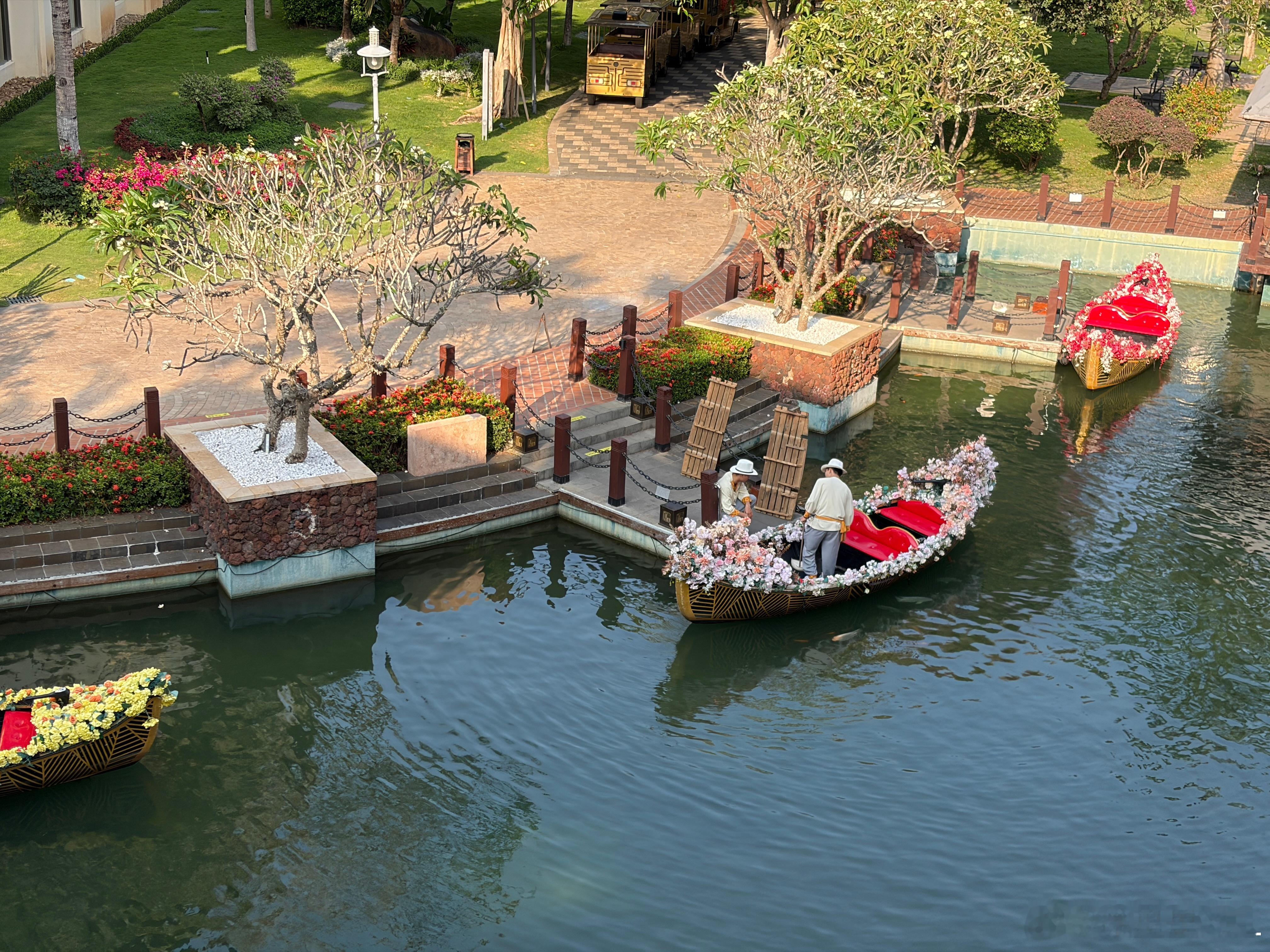 酒店特别美,到处都是椰子树。还有河,游船。