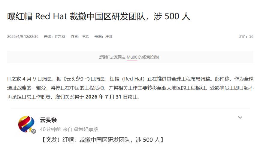 传Red Hat裁撤中国区研发团队 互联网消息指出,红帽——Red Hat或将停止在中国的工程活动,而随着他们将相关工作转移到亚太地区的工程枢纽,国区的部分员工也将不再承担日常工作职责,且雇佣关系即将终止。