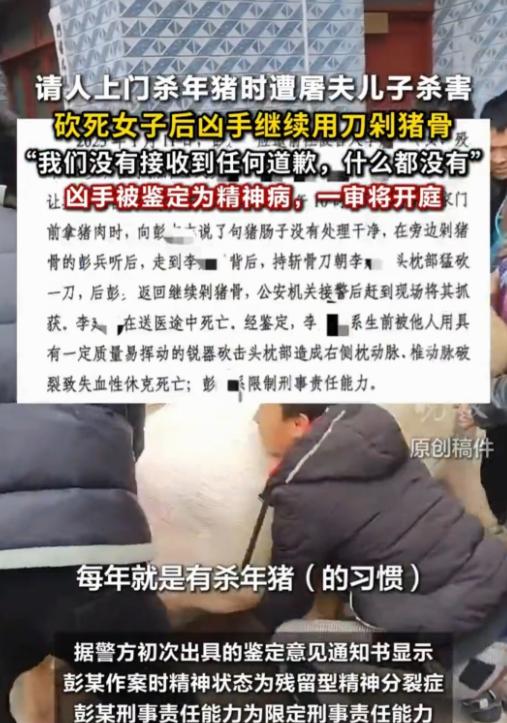 “一句抱怨引发的血案!”湖北,62岁女子从上海回老家,请一屠夫上门杀年猪,谁料,女子说了一句:猪肠子没搞干净。屠夫的儿子一旁在剁猪骨,突然拿刀对着女子后脖子砍了一刀,女子在送医途中死亡,事后,鉴定屠夫儿子有心因性偏执性精神病,而屠夫只赔偿了5万,也没道歉,就不管了,女子的儿子希望能严惩凶手。