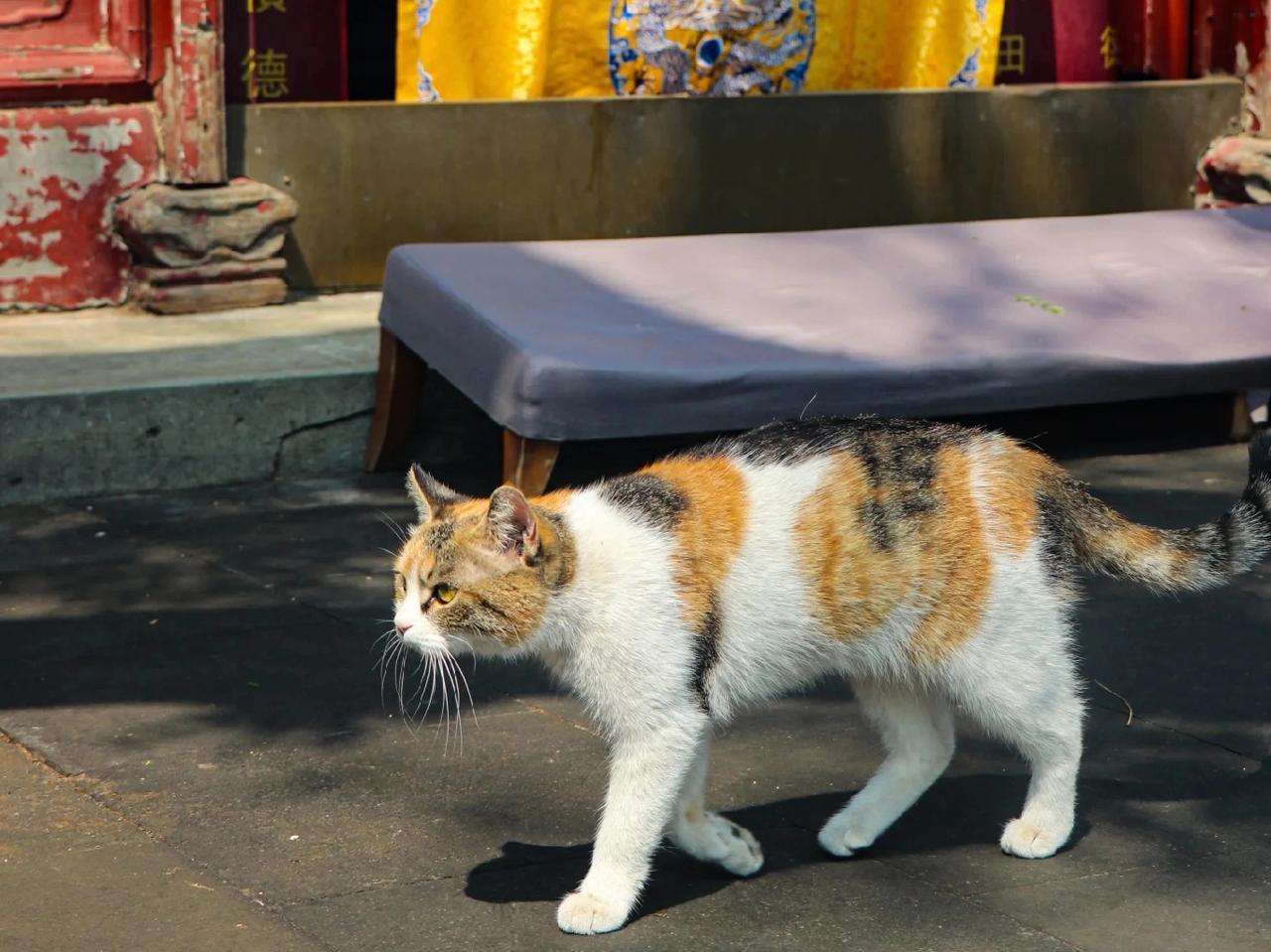 大家都纷纷拍照,很多人都上前去摸它,特别老实、温顺,都说它是招财猫。很多人说道观里的猫咪都是有灵性的,它们守着福地,路过的人沾沾仙气,摸摸喵星人还能讨个好彩头。这大概就是神仙地界的专属小福星吧,也太治愈了!三花喵咪 猫