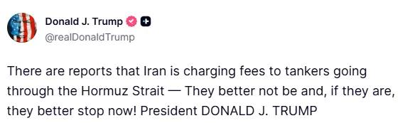 美国联邦政府总统唐纳德·特朗普在听到德黑兰方面向通过霍尔木兹海峡的油轮收取费用的“报道”后,向伊朗发出了警告。 “他们最好别是,如果是,最好现在就停止了!”他在自己的Truth Social平台上补充道。