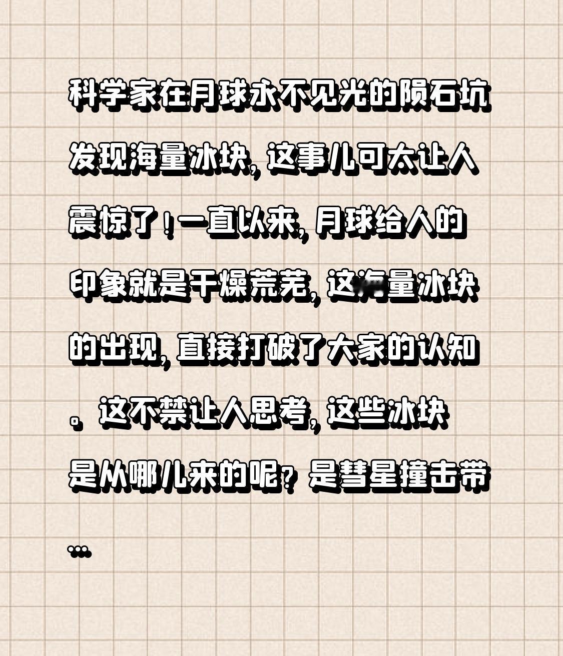 这不禁让人思考,这些冰块是从哪儿来的呢?是彗星撞击带来的,还是月球自身就有的?而且,有了水就有了生命存在的可能,这是不是意味着月球上曾经或者现在有生命呢?说不定未来人类能在月球上利用这些水源建立基地,开启星际移民的新篇章。这一发现就像一把钥匙,打开了探索月球的新大门,后续肯定还有更多惊喜等着我们。