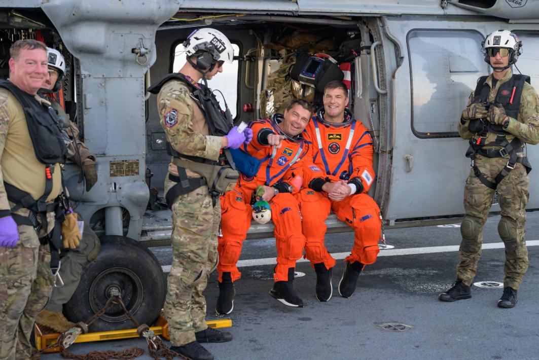 美国宇航局(NASA)最新发布的阿尔忒弥斯二号任务在近期成功回落后持续发布的照片,四名身穿橙色飞行服的宇航员在舰艇甲板上与军事回收团队合影