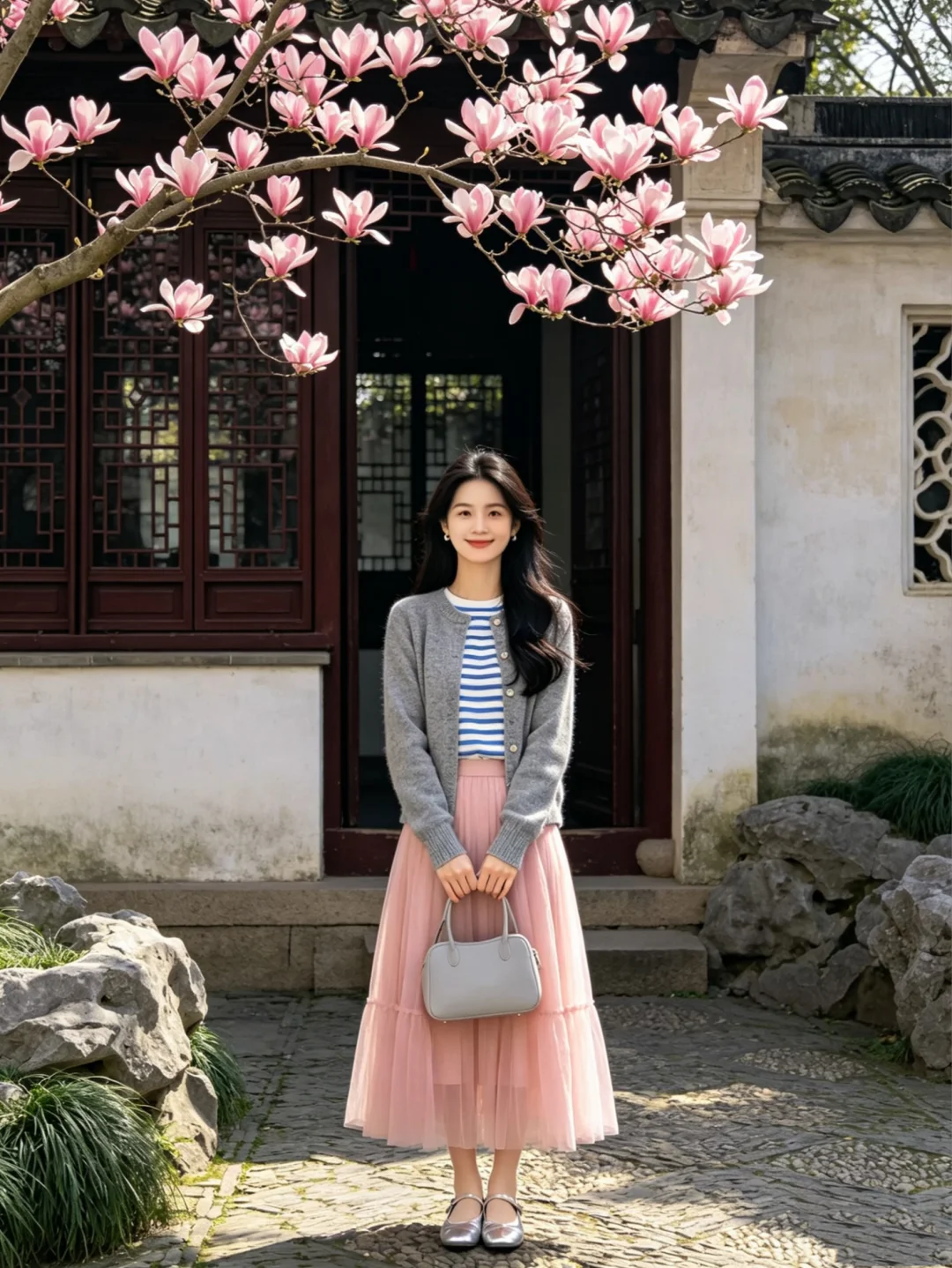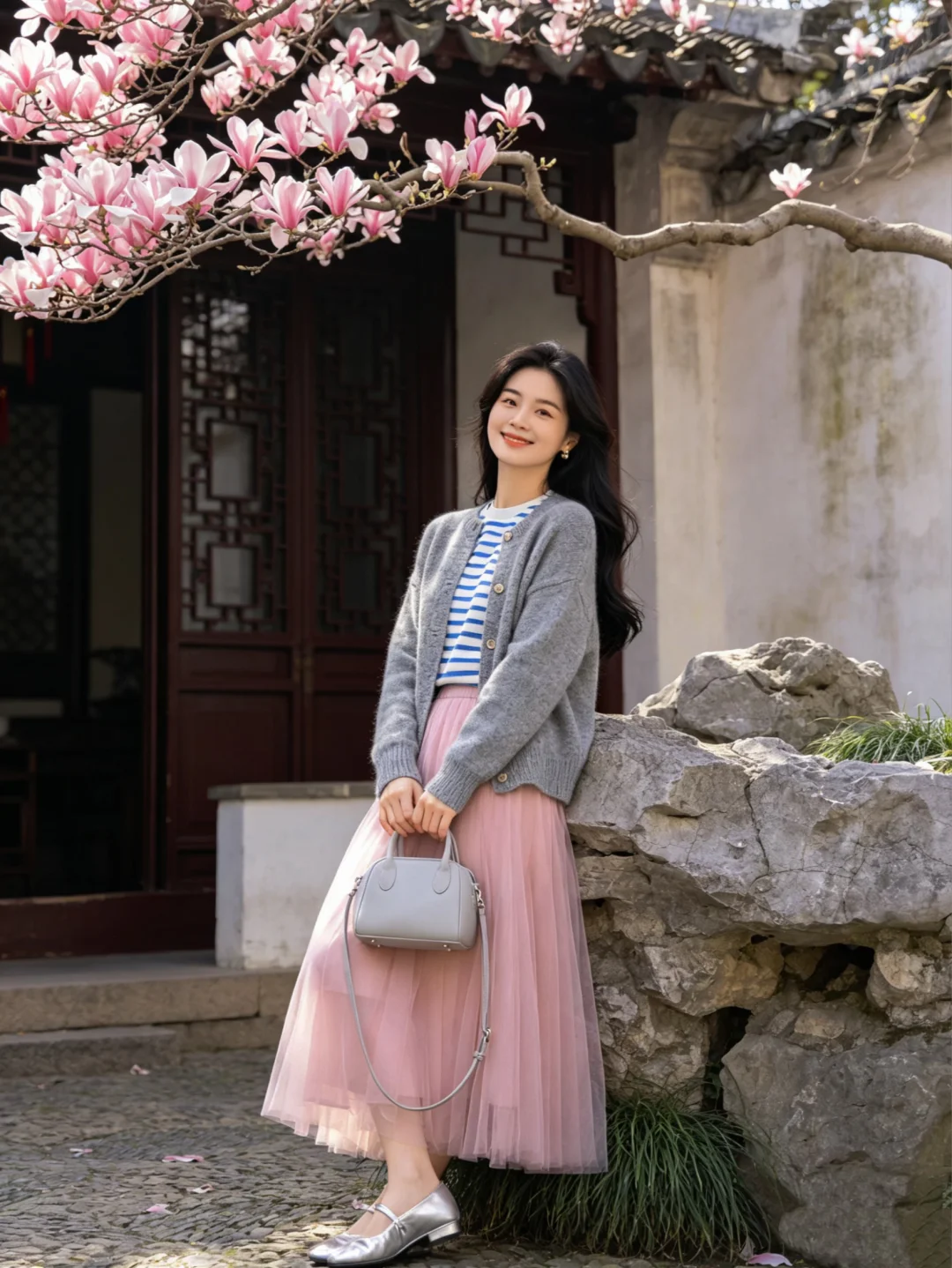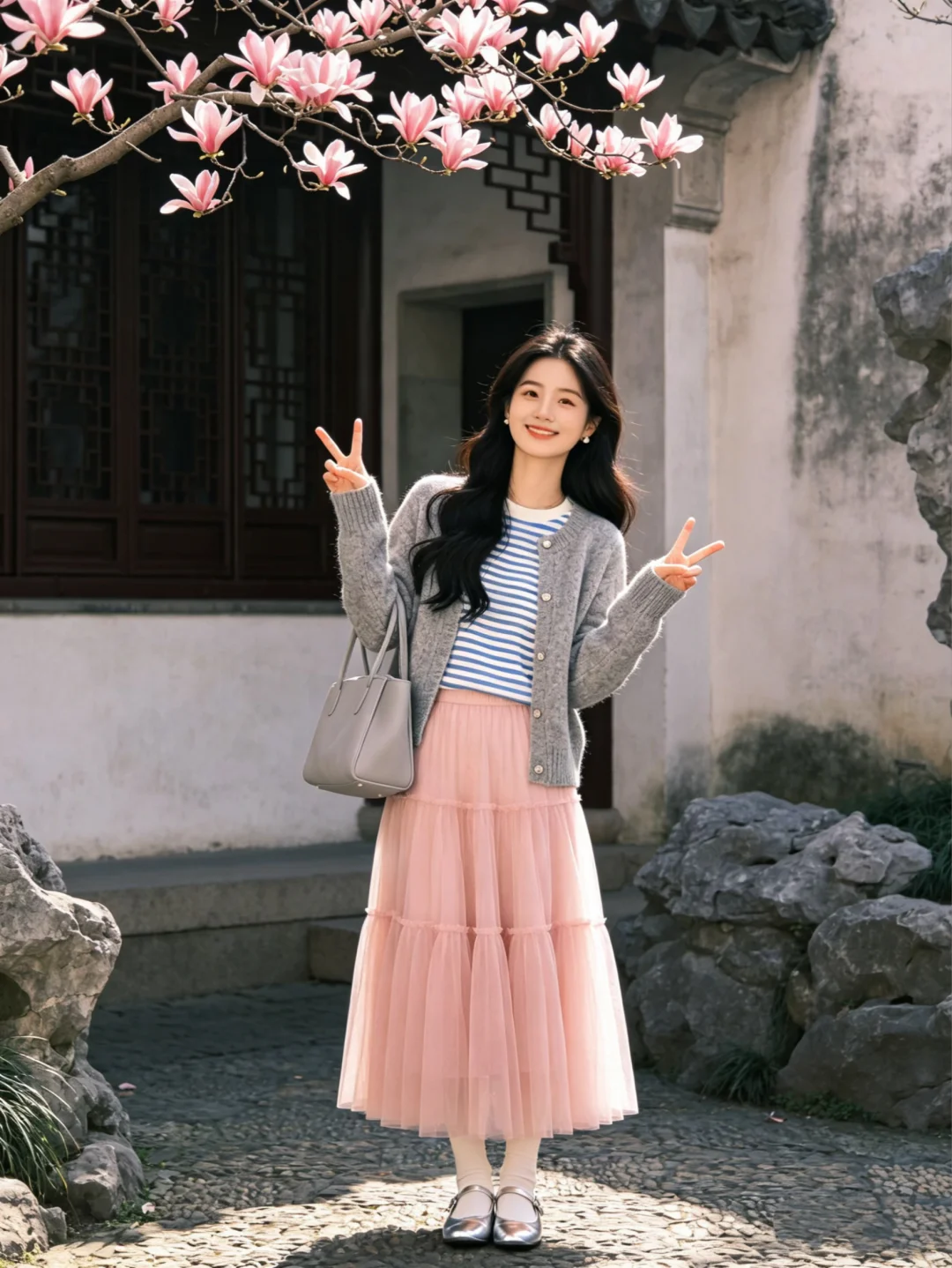 温柔穿搭风 赏花穿什么 春日阳光下站谁都美 纱纱裙搭配 温婉风穿搭 春天穿什么 春暖花开温柔风穿搭 灰色针织衫 粉色半裙 粉粉嫩嫩