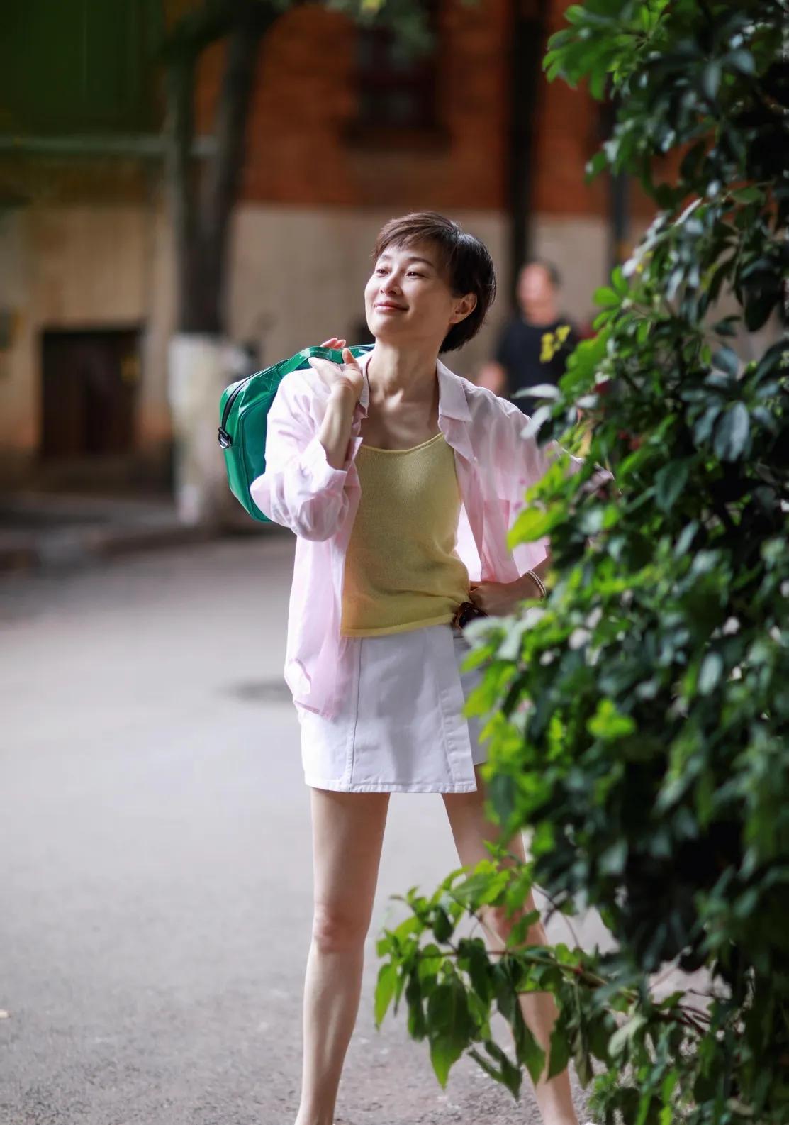 53岁吴越状态绝了!✨ 粉色衬衫+白色裤裙,减龄不止20岁! 松弛感拉满,活力满