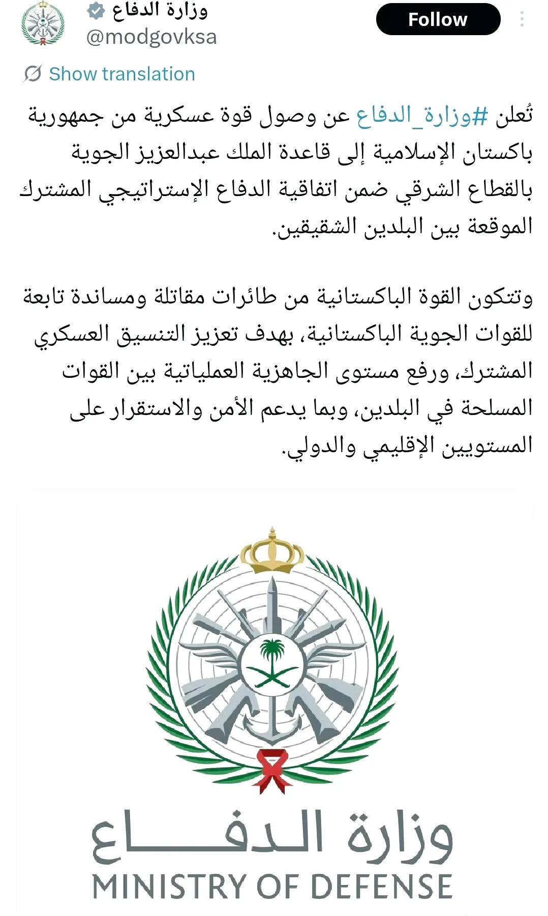 沙特阿拉伯国防部宣布:根据沙特与巴基斯坦两国签署的《战略共同防御协议》,巴基斯坦开始在沙特部署军事力量,第一批巴基斯坦空军人员、战斗机和支援飞机已抵达沙特阿卜杜勒-阿齐兹国王空军基地。