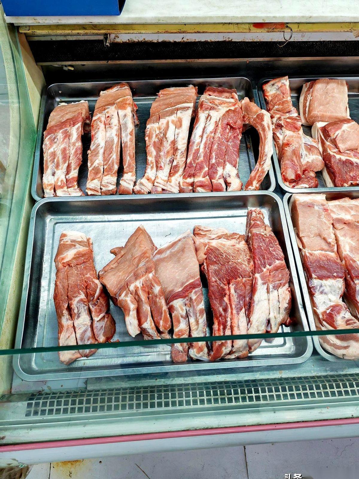 我往前凑了凑,以为自己看错了。旁边的肘子肉,7块。小排骨,也才7块8。这价格,跟有些蔬菜一个价了。