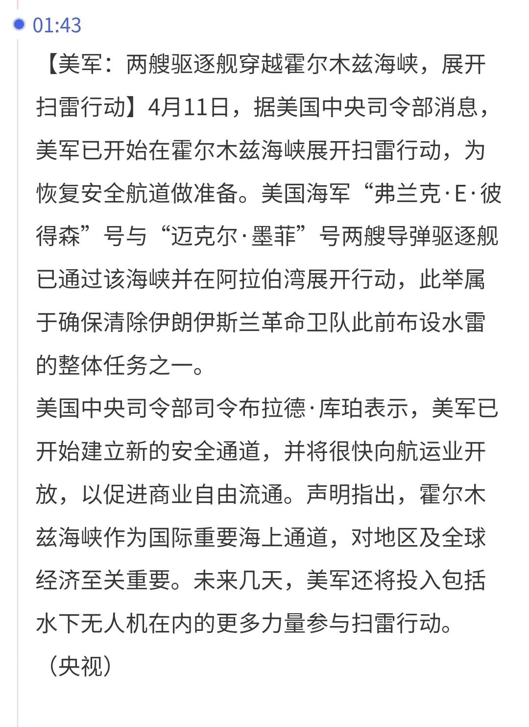 1:美国两艘军舰穿越霍尔木兹海峡展开扫雷行动,未来几天还有更多的水下无人机参与扫雷行动。