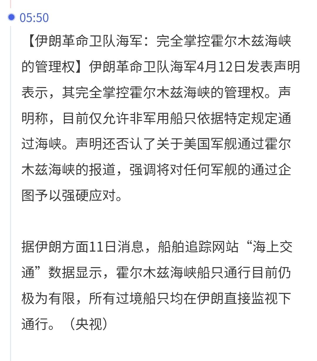 2:双方对美军军舰通过霍尔木兹海峡表述有异,美军舰应该是通过了霍尔木兹海峡,但并没有在海峡内停留很久,更没有开始进行扫雷行动。