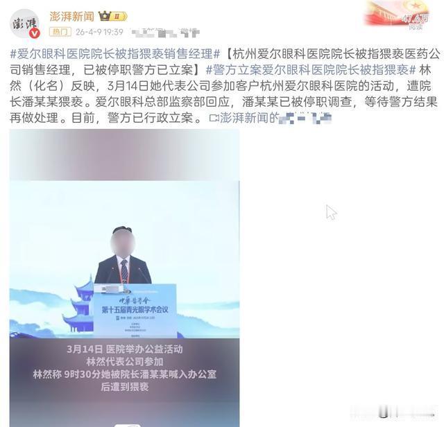 杭州爱尔眼科院长办公室丑闻曝光!女药代遭锁门猥亵,妻子竟以“时差没倒过来”荒唐甩