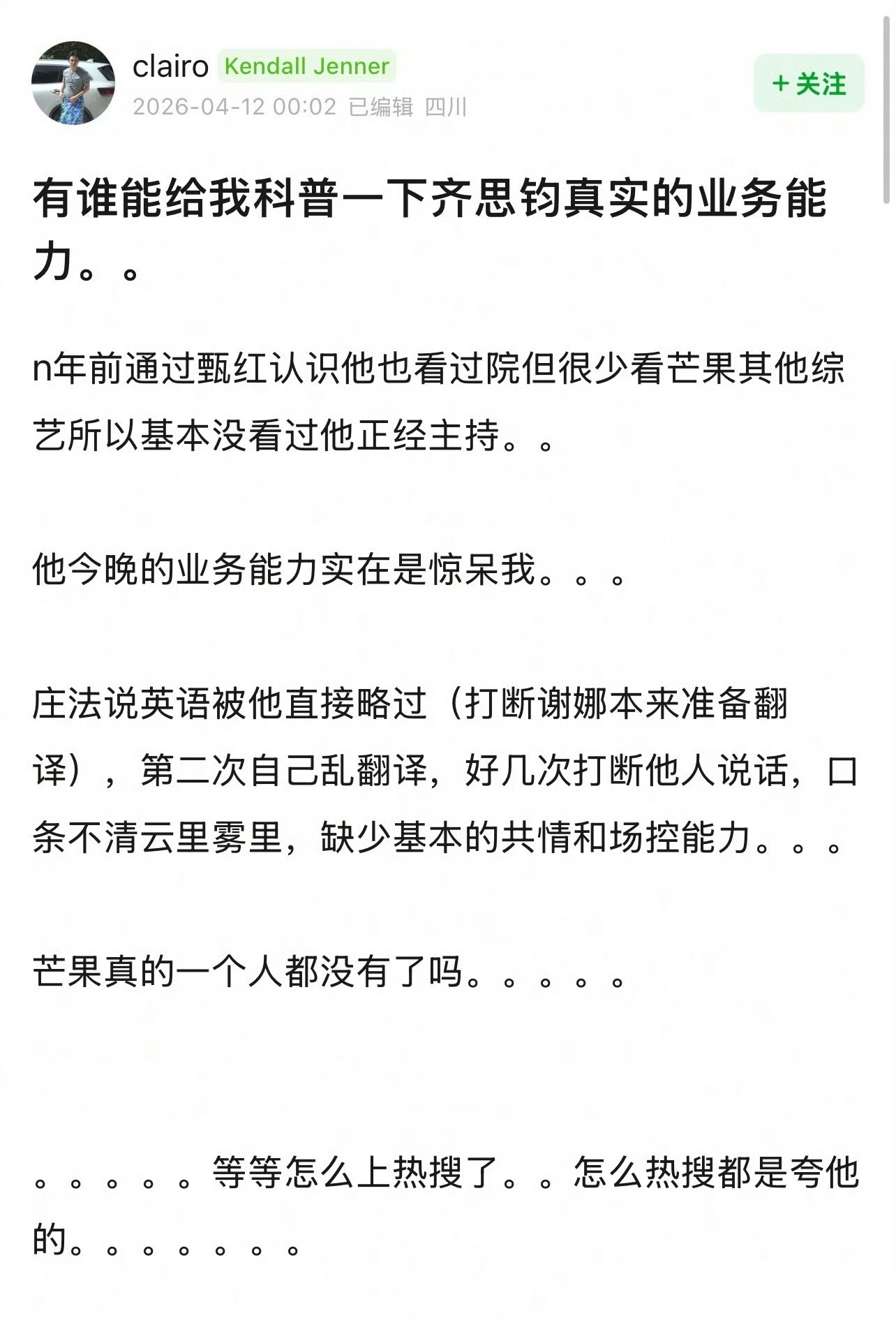 齐思钧真实的业务能力是什么水平?浪姐 剧本芒果 改口癖