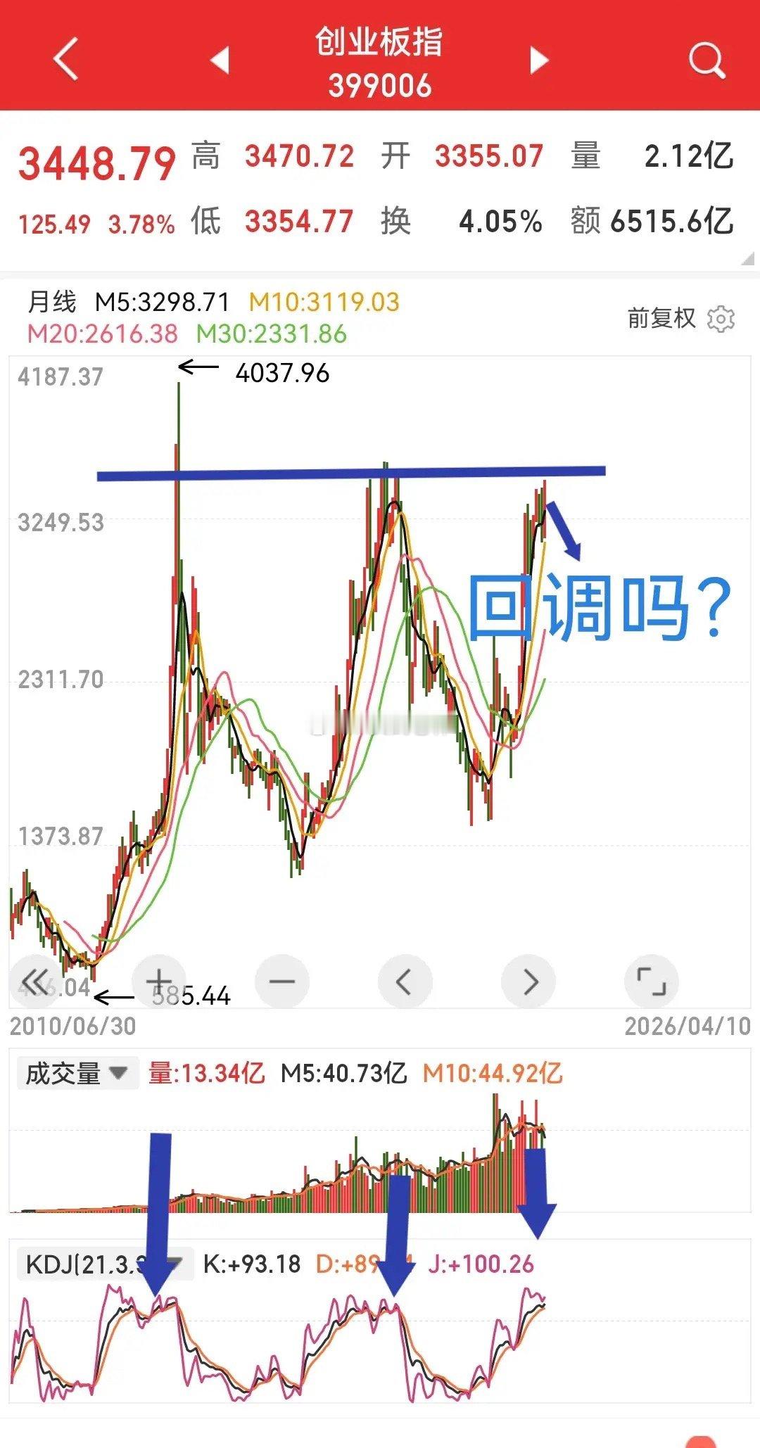 1、上周创业板指数创出四年来的新高,距2021年和2015年月线收盘高点仅一步之遥。从月线图的KD指标上可明显看出,当前的KD值与前两个月线高位区域非常相似,KD在高位区域且J值已经钝化。
