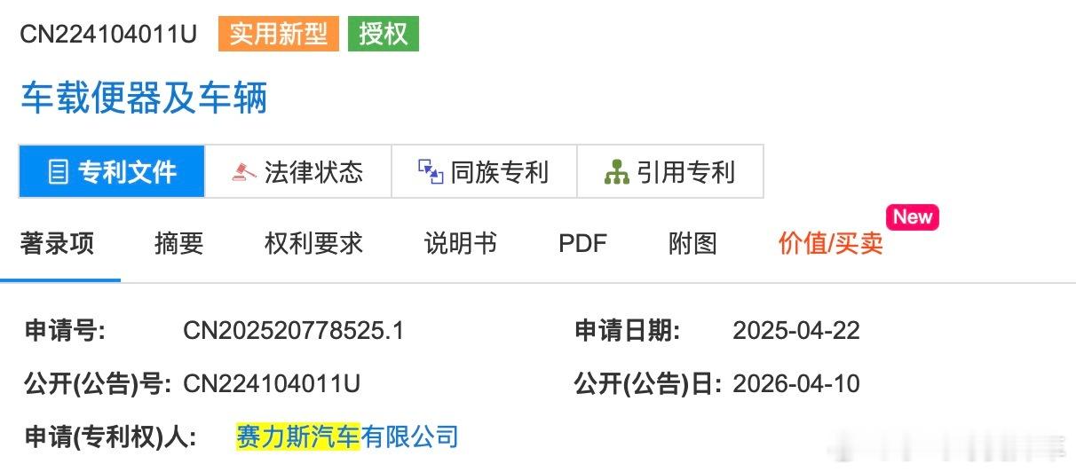 看了一下赛力斯汽车确实申请了“车载便器”专利。