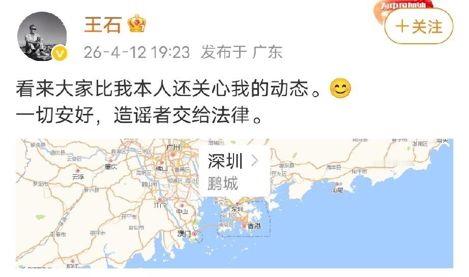 博文发布半小时后,王石老婆田朴珺立即回应,称其“造谣”,十几分钟后,王石本人也发文回应了,称“一切安好”,还附上了自己的所在位置,王石目前在深圳。