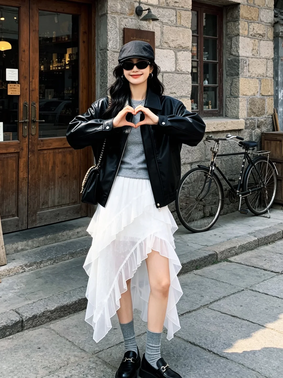 皮夹克半身裙 甜酷穿搭 韩系穿搭 机车皮衣 黑白色系搭配 纱裙 白色裙子这样搭配