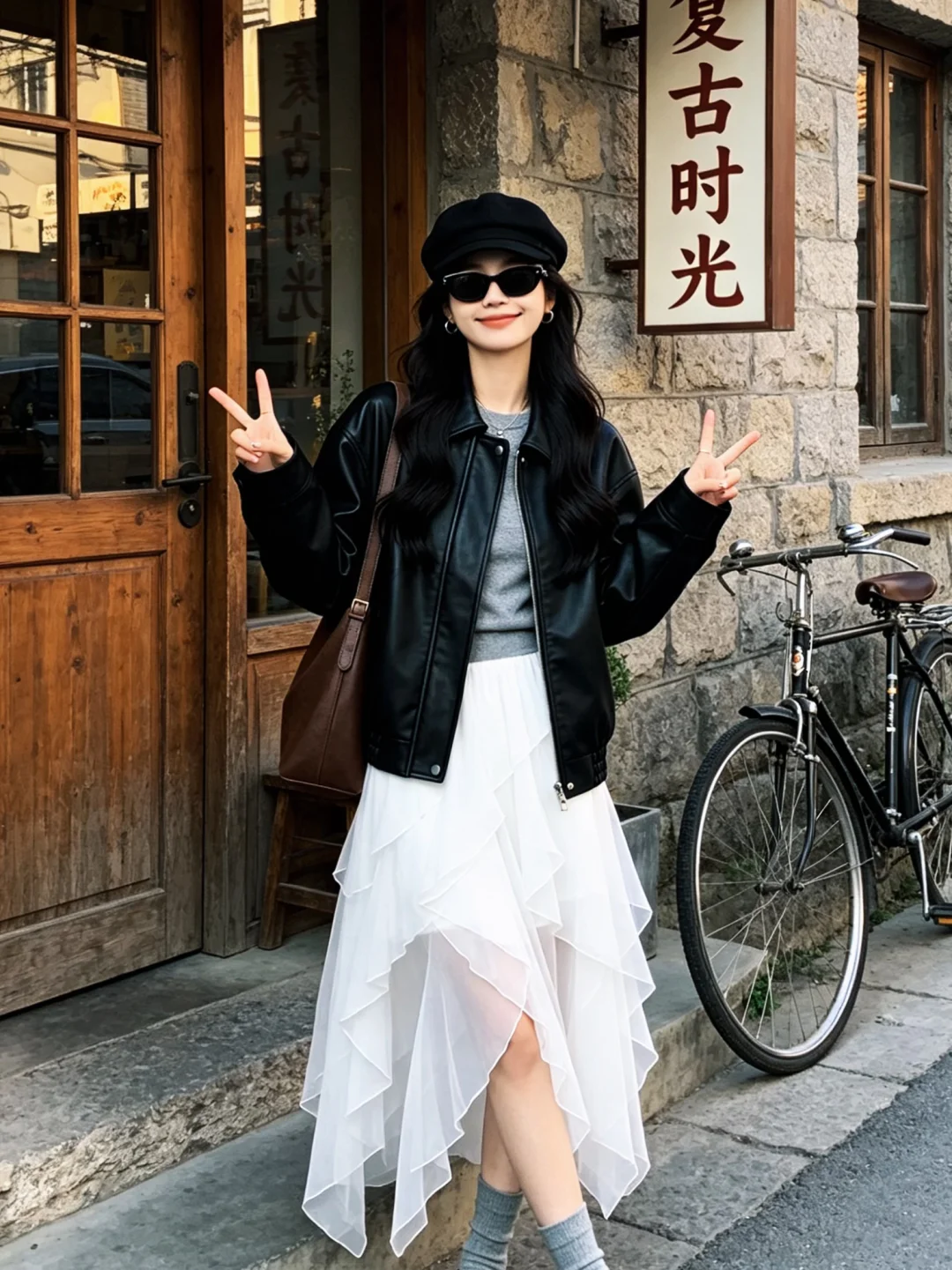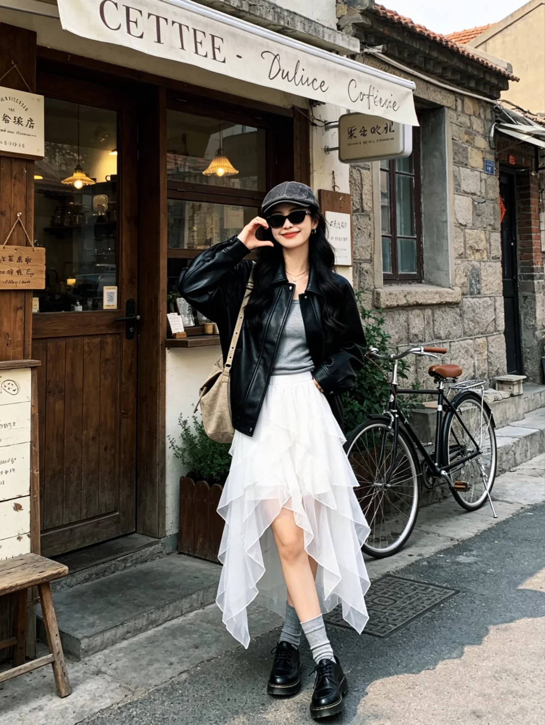 皮衣+白纱半裙,好韩系呀