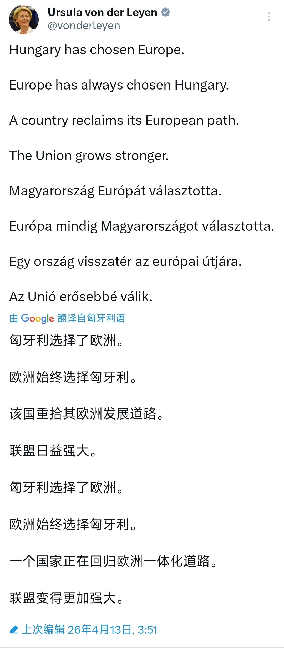 欧尔班败选后,欧盟委员会主席冯德莱恩今天(北京时间4月13日)写道:“匈牙利选择