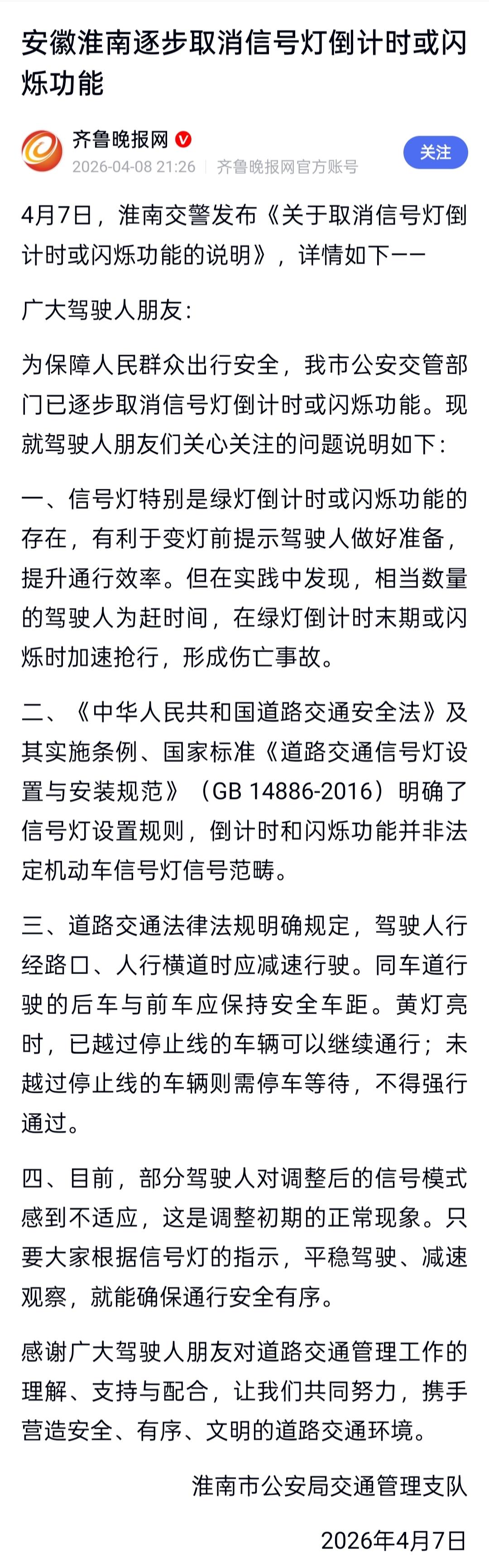2026年4月7日,安徽淮南市公安局交通管理支队发布说明,正式确认该市已逐步取消信号灯倒计时或闪烁功能。