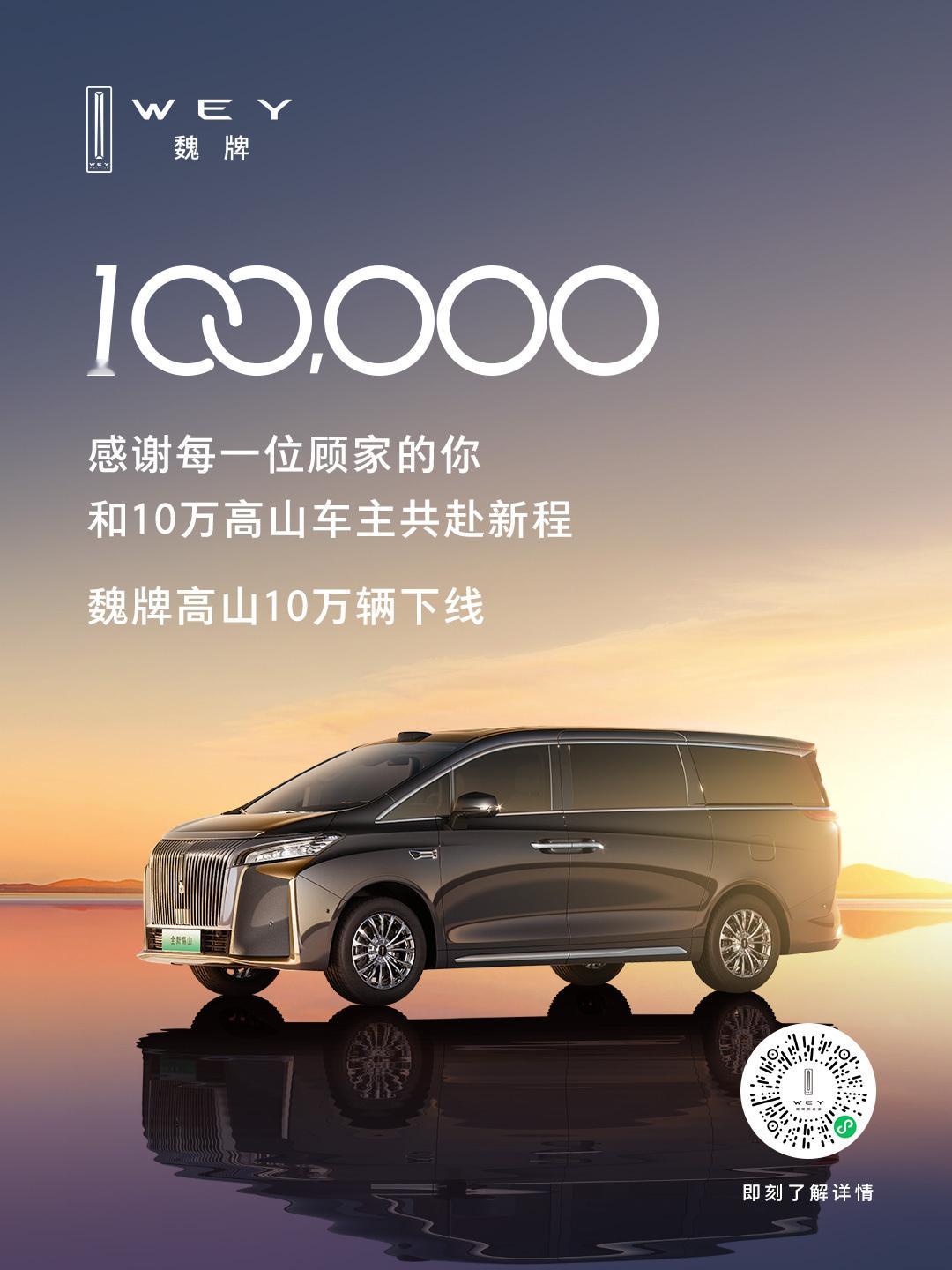 魏牌高山连续7个月蝉联新能源MPV销量冠军,现在高山第100000台已下线。魏牌高山2025年9月-2026年3月连续7个月蝉联新能源MPV销量冠军,高山凭借Hi4性能版智能四驱、宽敞舒适安全空间和长续航等硬核产品力,重新定义高端家庭MPV标准,得到广大用户的喜爱。开启mpv家庭新时代魏牌高山10万辆下线