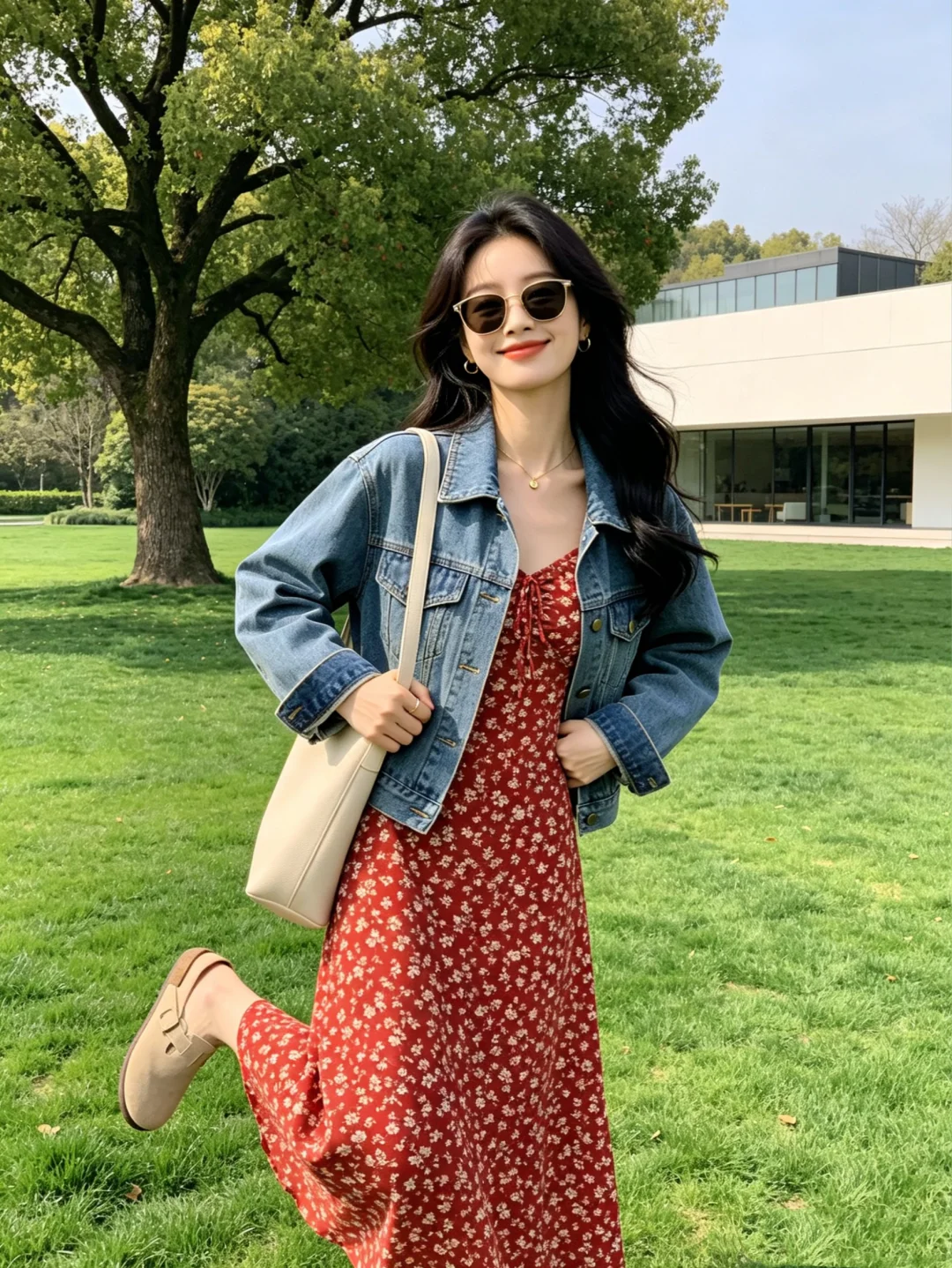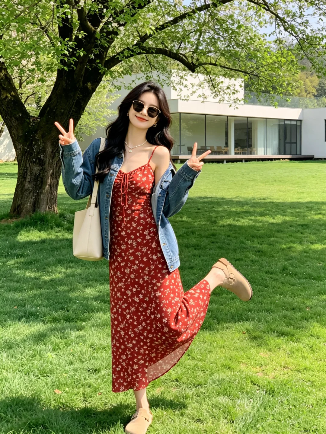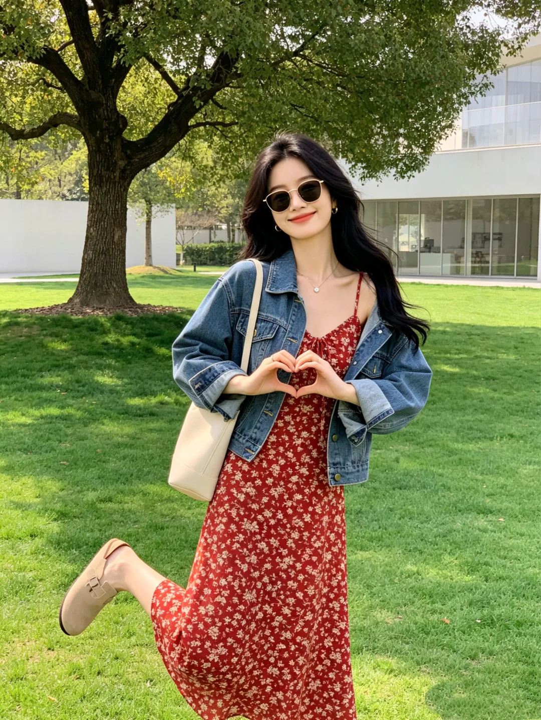 温柔穿搭风 复古碎花裙 碎花吊带裙 茶歇风穿搭 谁还没有一条碎花裙 小红裙 显白连衣裙 红色连衣裙 牛仔外套 显白穿搭