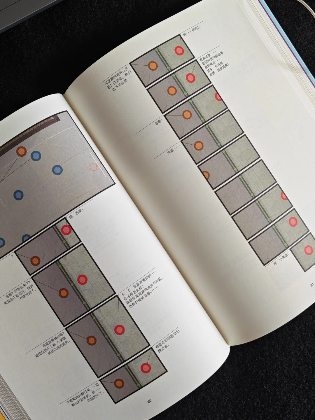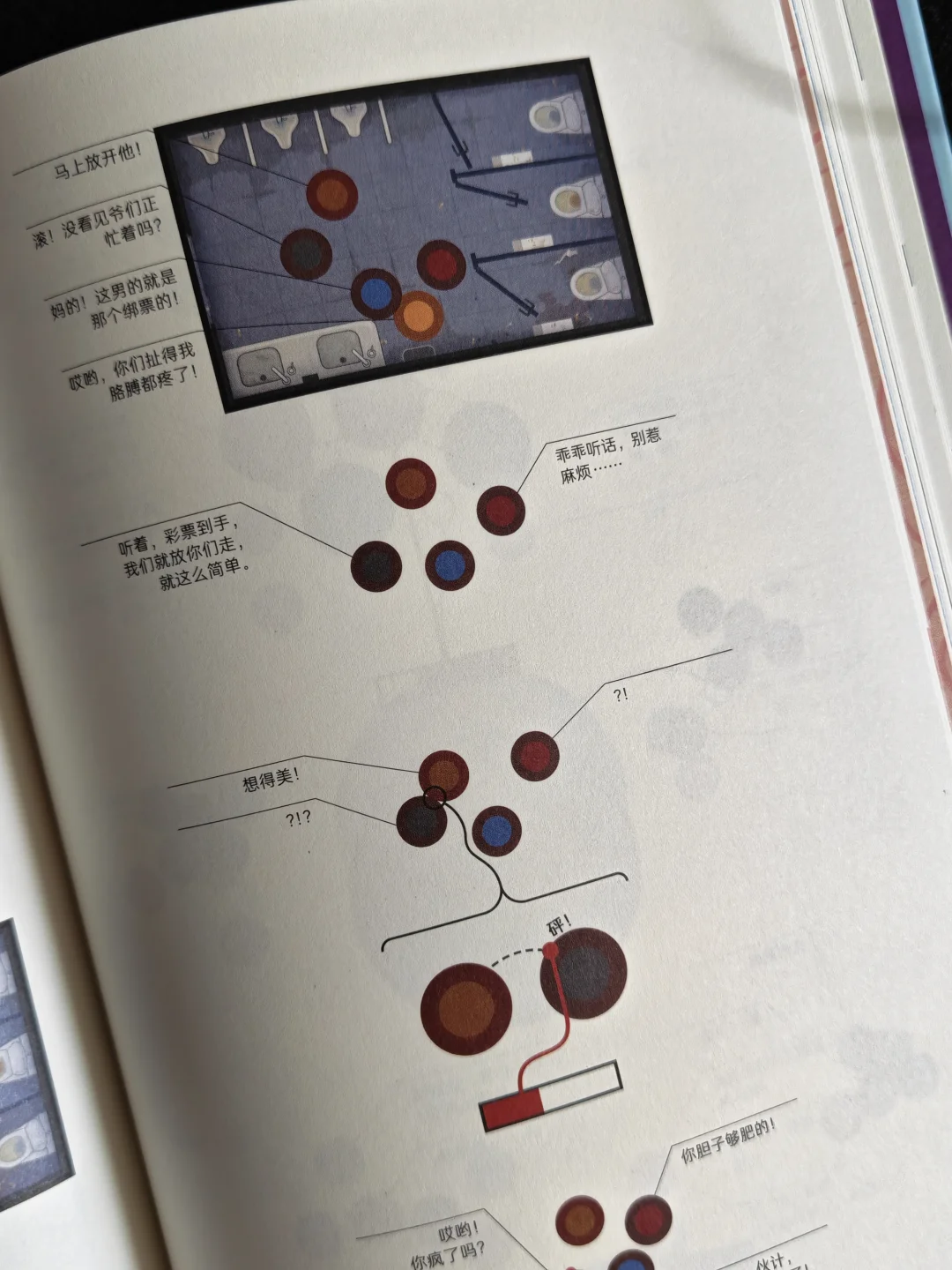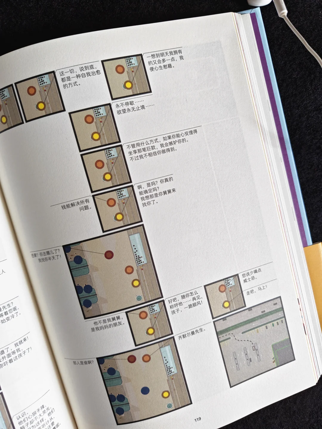 最吸引人的还是它的叙事方式。完全不按传统漫画分镜来创作,直接用对话气泡的小圆点、带箭头的虚线、建筑标识的图标,还有那些色彩丰富但很抽象的表达,仅凭色块与构图就把整个故事流畅的表述完整。故事情节虽然有点意犹未尽,但它俯视视角的思维导图一般的图文表达方式很让人眼前一亮。