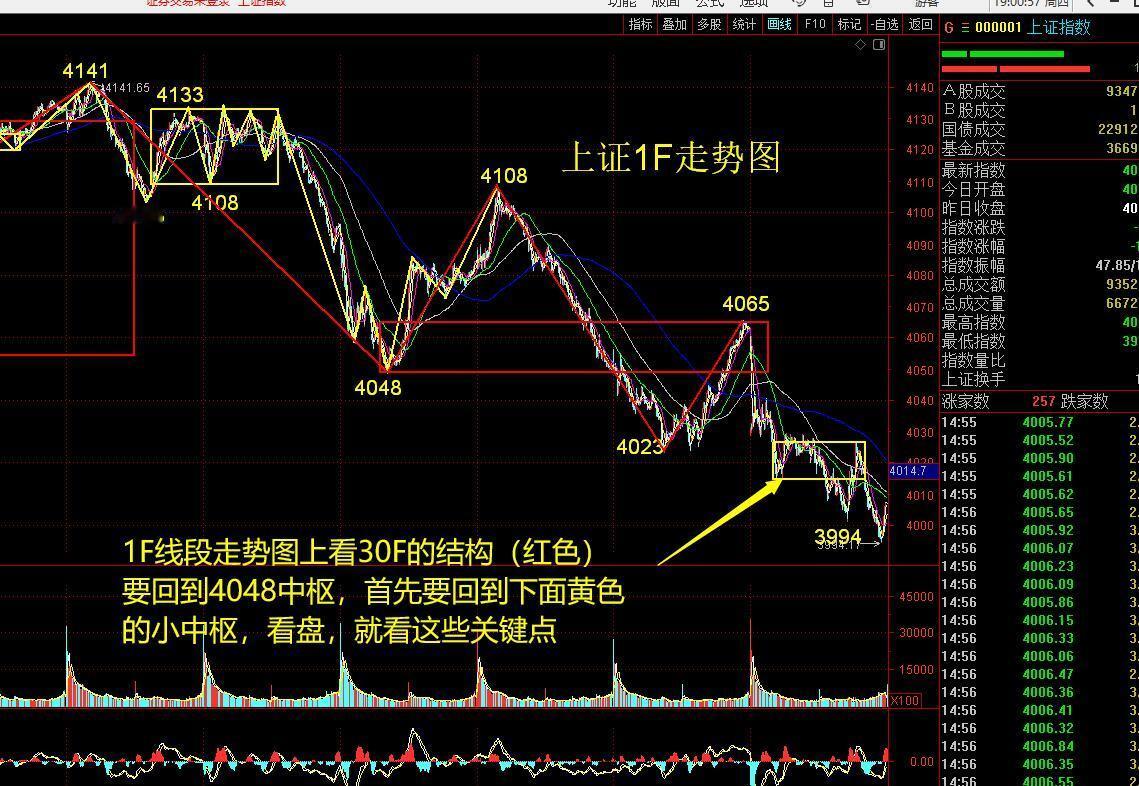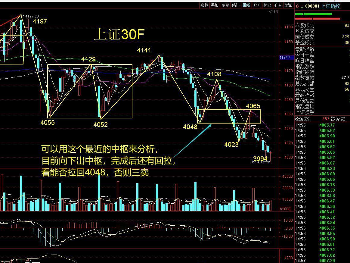 今天就延续了昨天4065向下的30F笔出中枢走势,单边向下,最低点