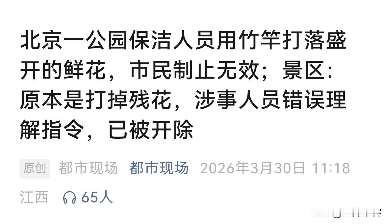 被开除的工作人员冤不冤?!我觉得冤死了。都市现场消息,景区说是为了打掉残花?那么问题来了,打掉残花科学吗?是指令理解错误,还是指令本身有错误?