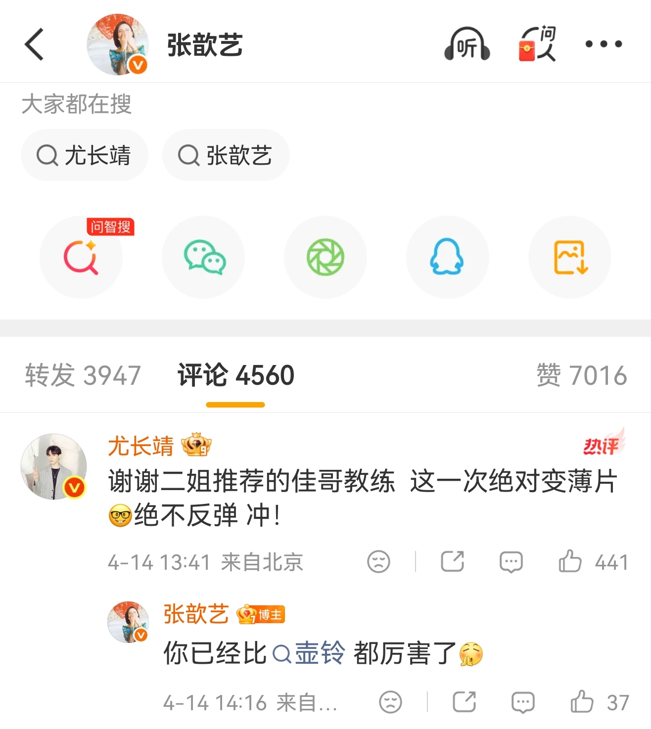 张歆艺尤长靖互动 尤长靖发誓“这次绝对变薄片绝不反弹”,看来是被教练和二姐双重监督了。张歆艺这个推荐人,售后做得挺到位。张歆艺推荐尤长靖教练