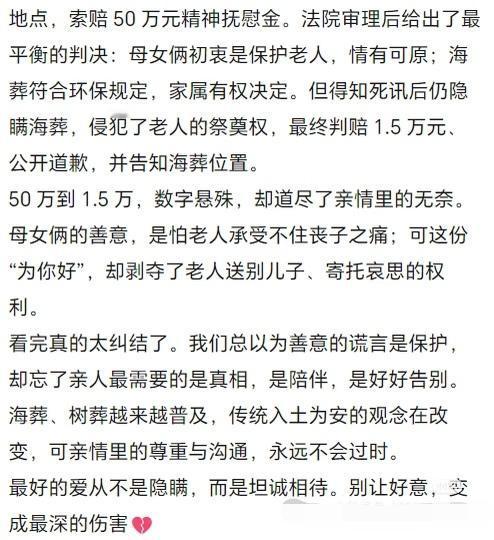 我也觉得不该瞒着老人,应该让她知道。虽然老人会痛苦,而今是又痛苦又留下遗憾。