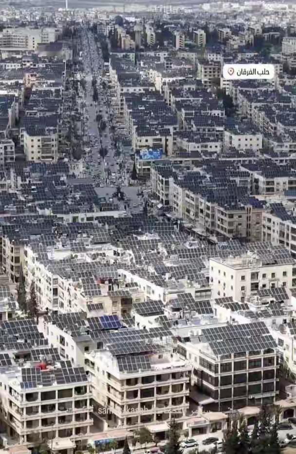 叙利亚电视台在社交媒体上发了一段视频,讲的是叙利亚阿勒颇的楼顶几乎都装着光伏发电的板子,基本都是东大产的。这张视频截图可以看到壮观景象。