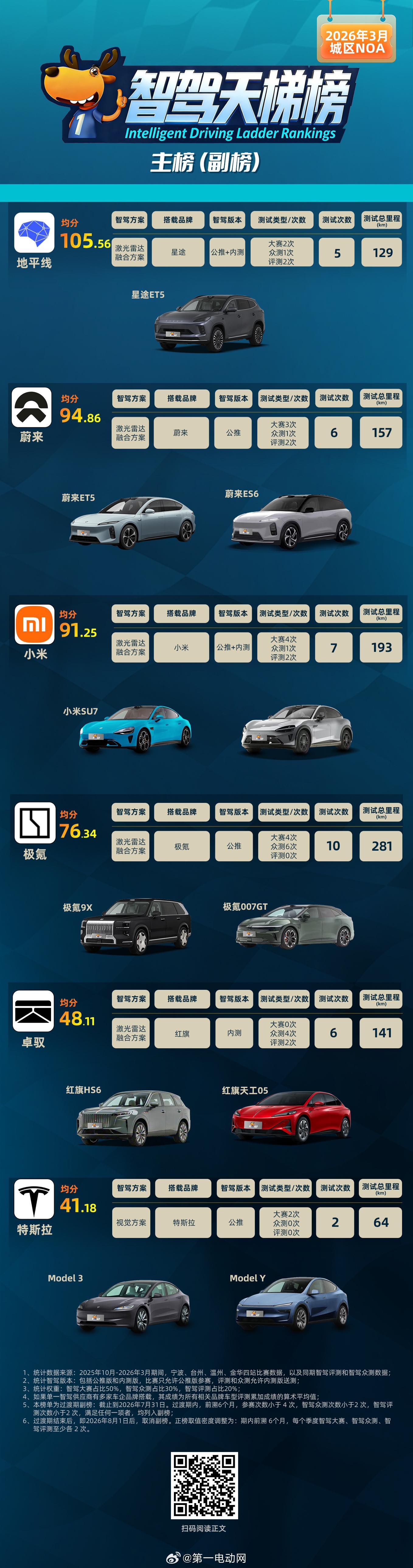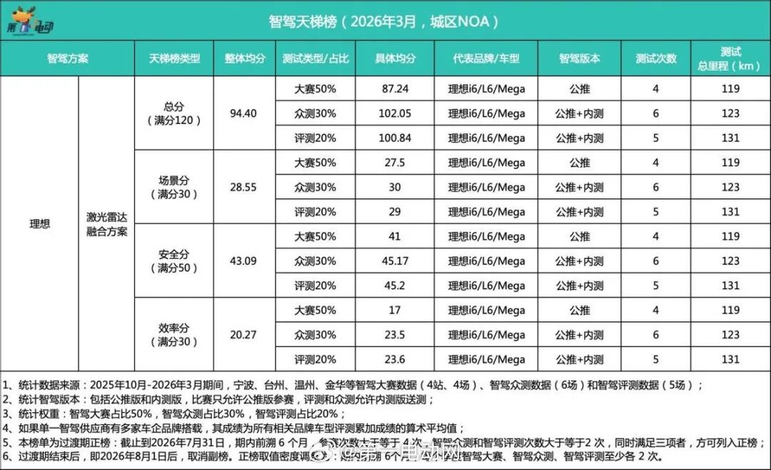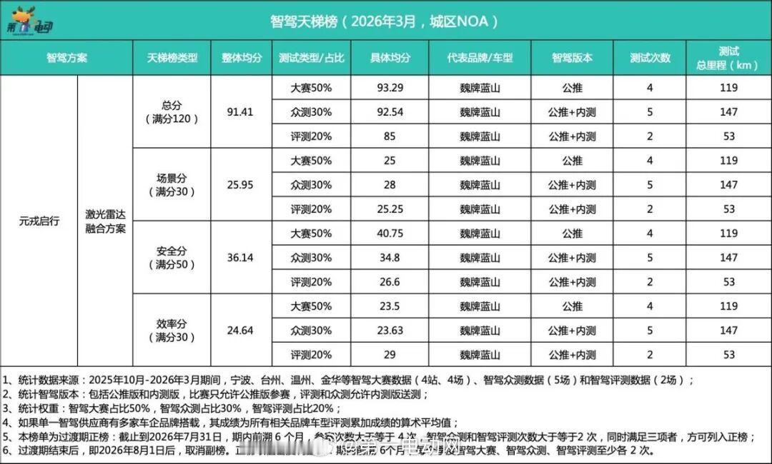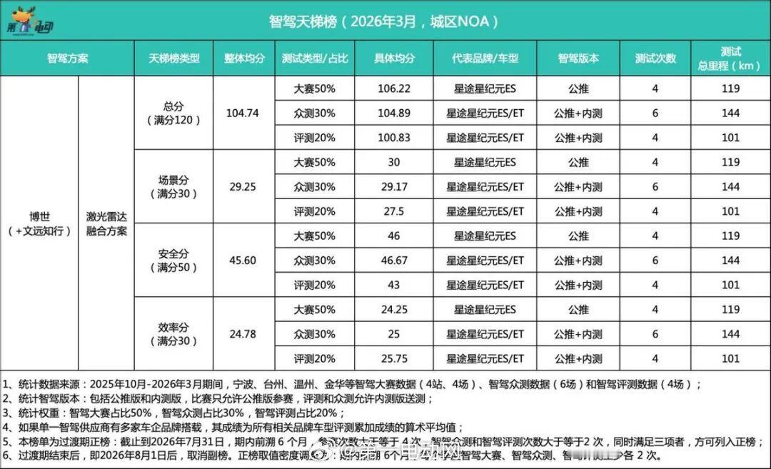 📋 3月副榜(测试次数不达标,成绩真实有效)地平线|105.56分(↑7.3分)金华站决赛110.43分、上海众测115.7分、北京A/B路线107.5/101.68分,北京C路线超100分(内部观测)。落地星途ET5、深蓝L06、iCAR V27等,预计5月杀入正榜。