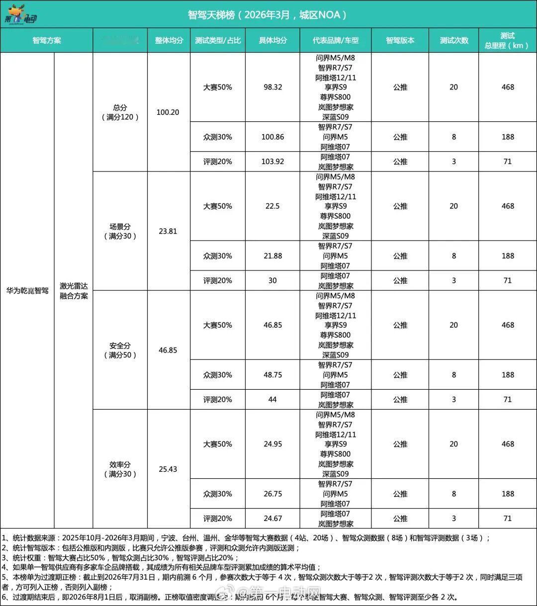No.2 华为乾崑智驾|100.20分(↑7.05分)冲至第二。剔除2025年7-9月大量低分,新增金华站智界预赛117.89分、岚图预赛113分等,北京A路线首现满分120分。仍受宁波站低分拖累,下月将剔除。