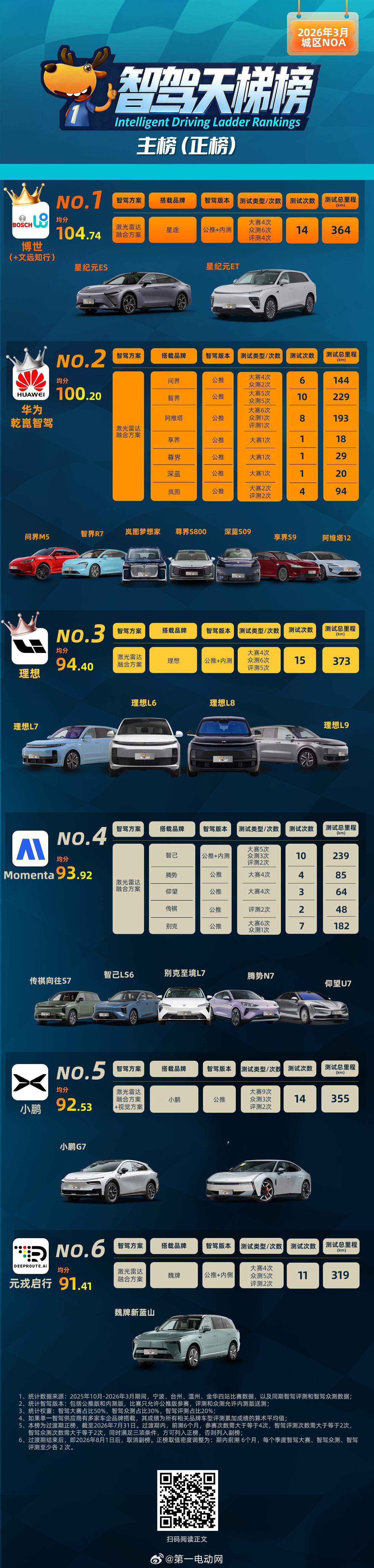中国智驾战力天梯榜 (2026年3月,上)|博世文远蝉联冠军,华为冲至第二,地平线蔚来小米副榜狂飙 第二届中国智驾大赛