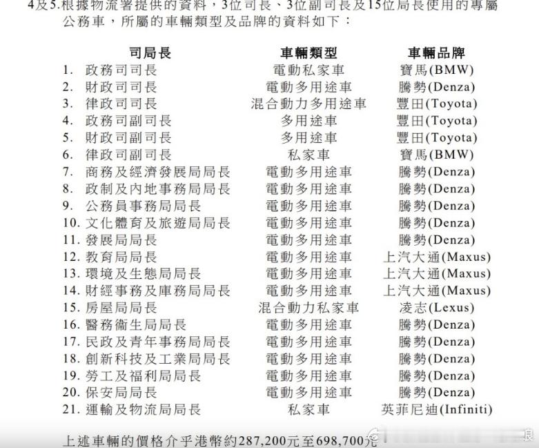 香港公务车名单看得我瞳孔地震!以前香港大佬标配的丰田、凌志、英菲尼迪,现在直接被腾势、上汽大通、宝马(哦不对,宝马是电动私家车款)给干成非主流了?!11/21的司局长都开腾势D9,价格区间28.7万-69.8万港币,直接把“高端公务出行”的话语权抢回来了!合着以前的日系“神车”,现在在公务采购里都快凑不齐半壁江山了?说真的,这波不是国产变了,是时代变了,谁还敢说国产车只能走低价路线?比亚迪大v聊车新能源大牛说