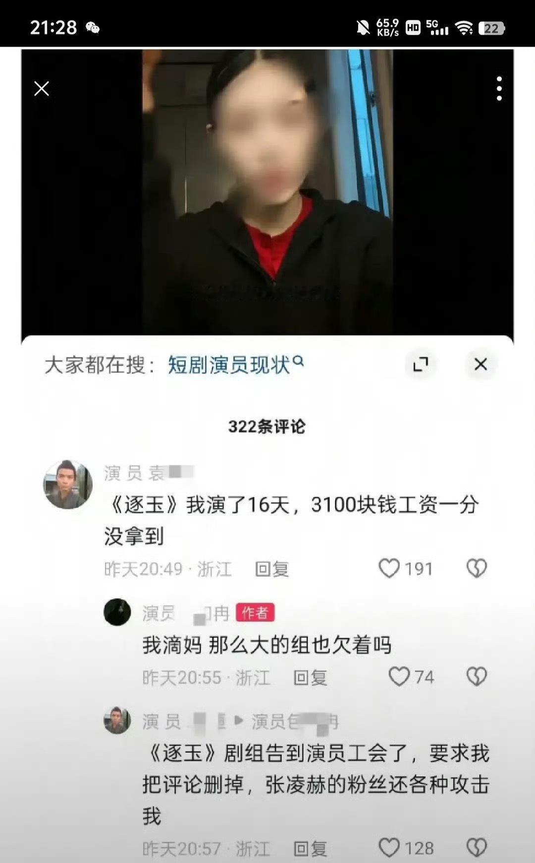 有《逐玉》群演说这个剧组拖欠了3100元工资至今一分钱没拿到,剧组让他们删帖,张