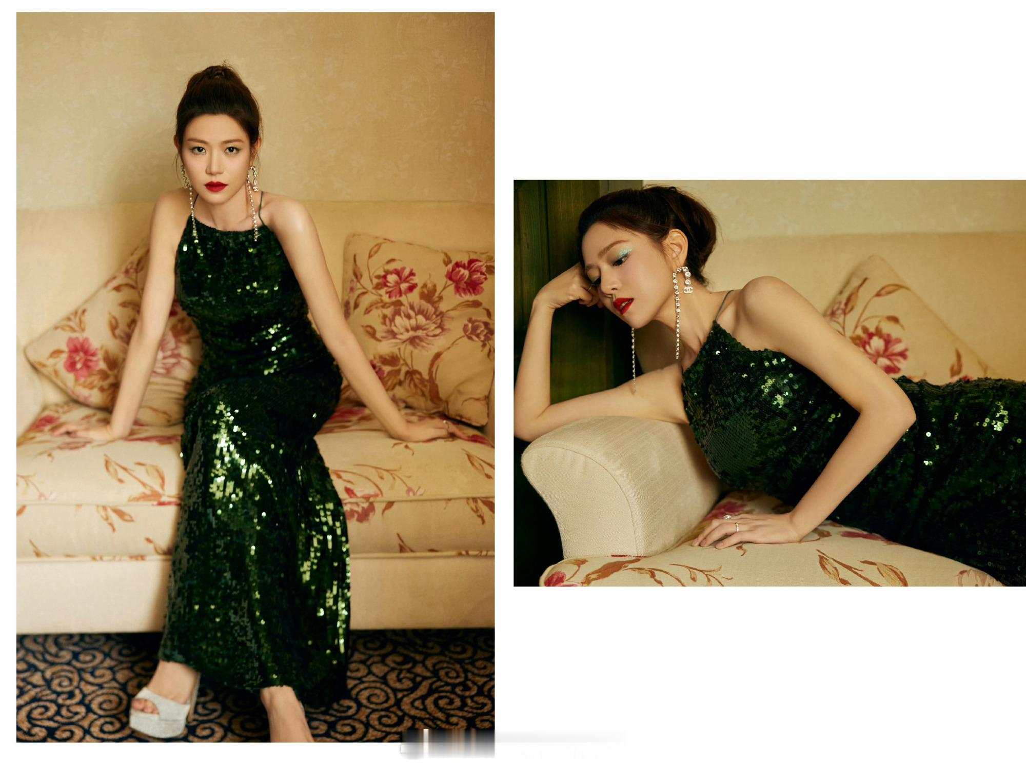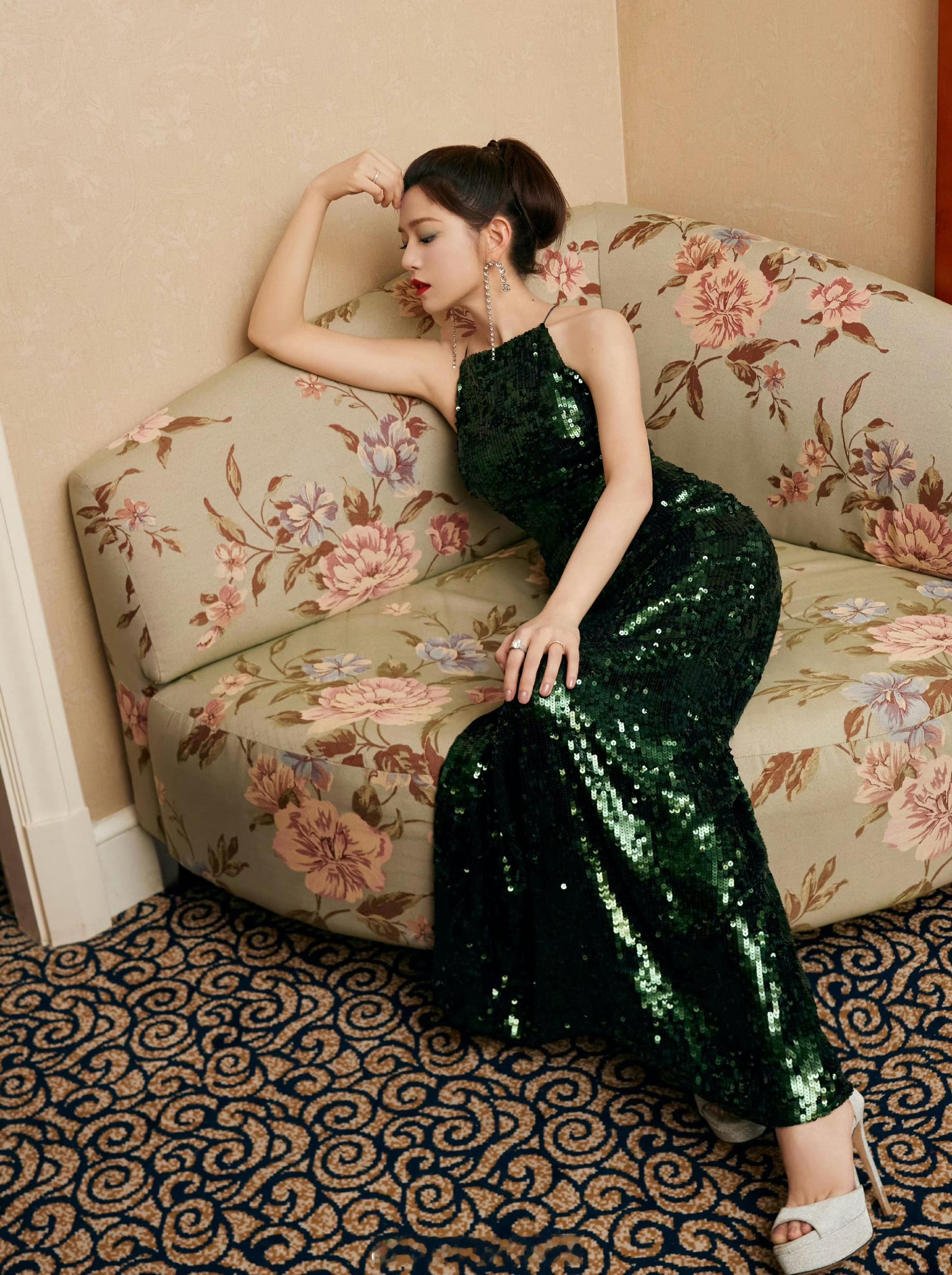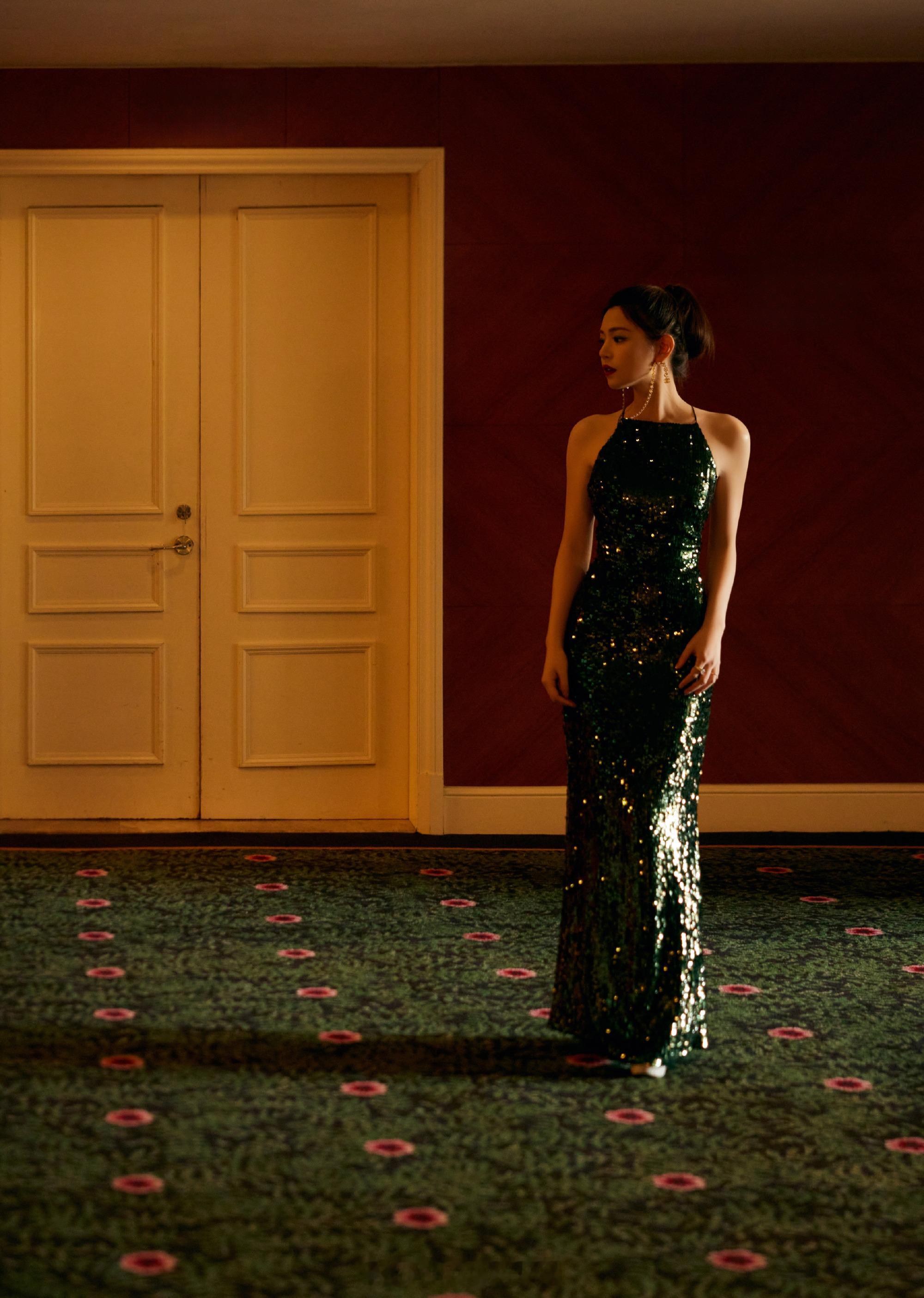 陈妍希墨绿亮片长裙优雅写真
