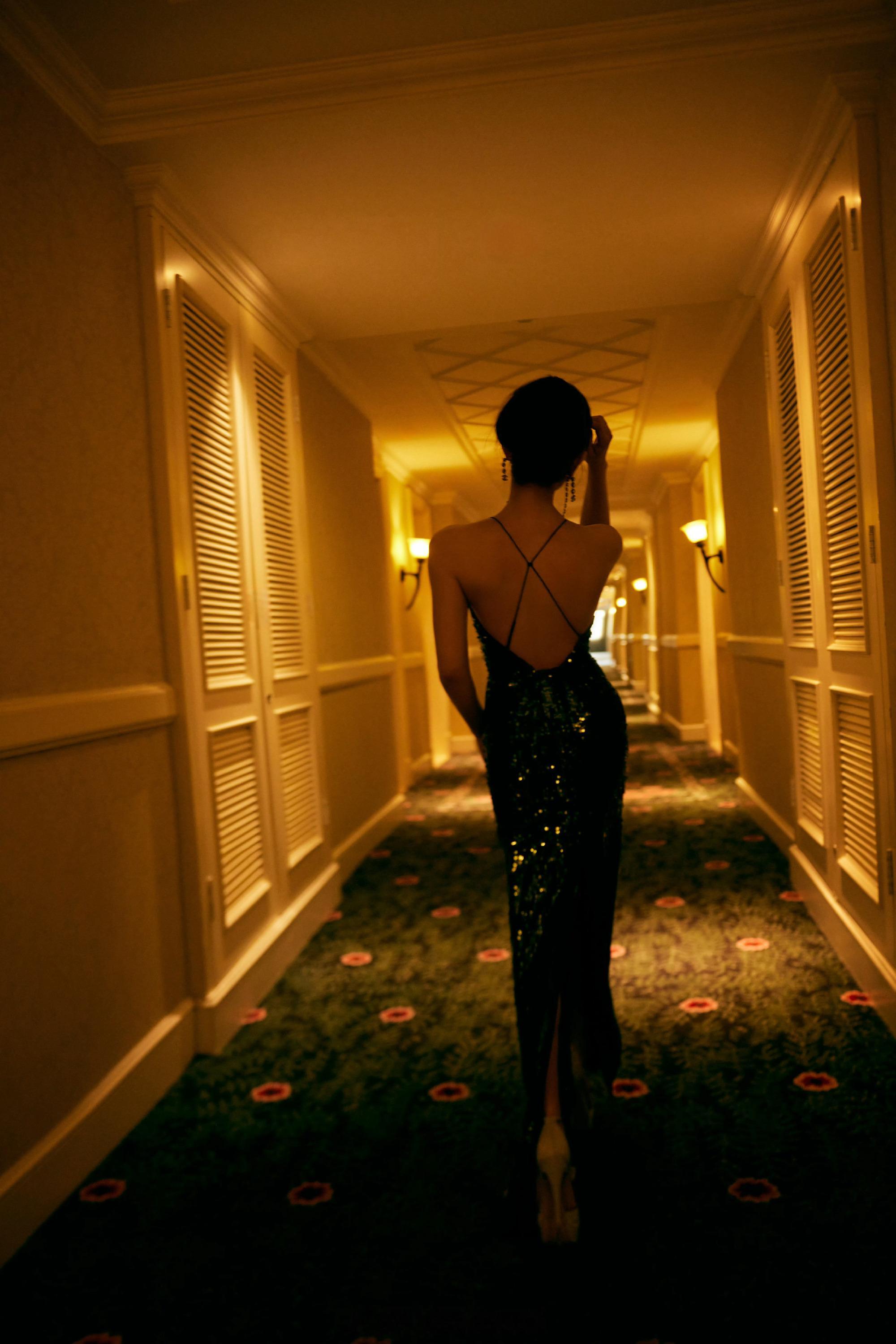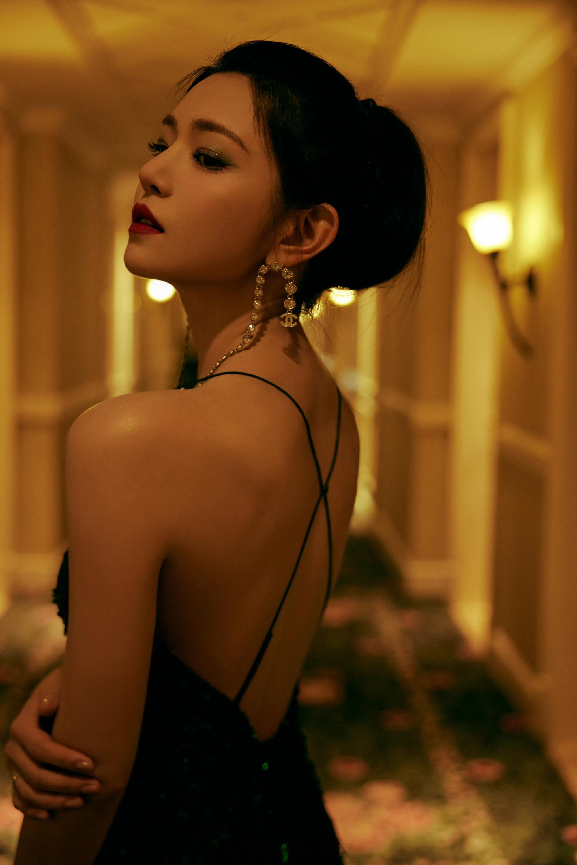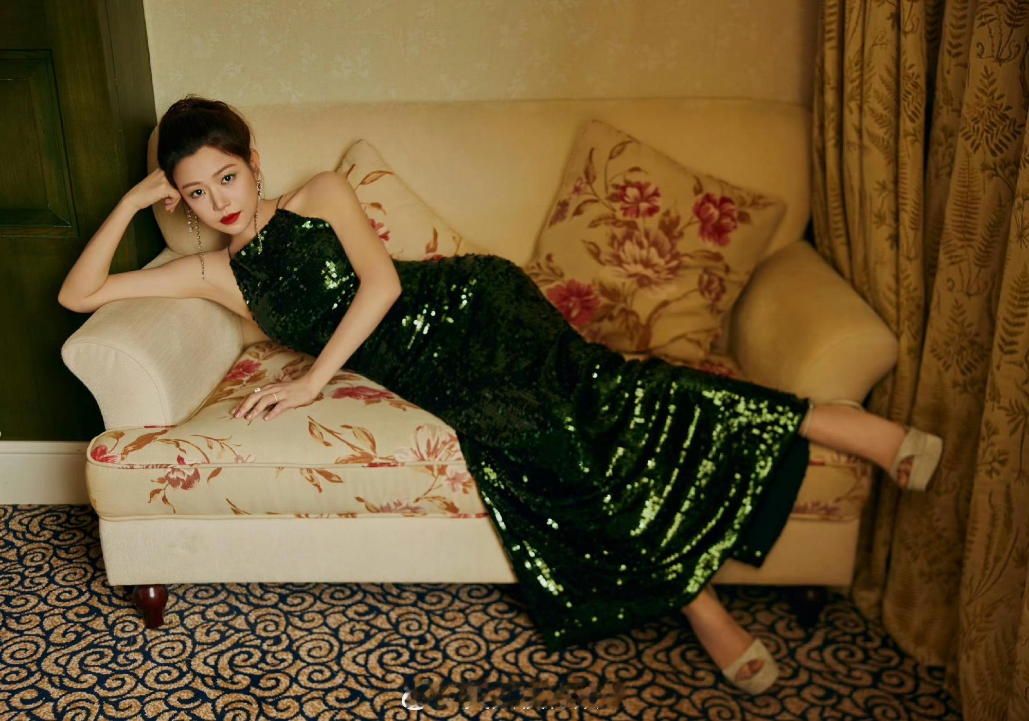 陈妍希墨绿亮片长裙优雅写真