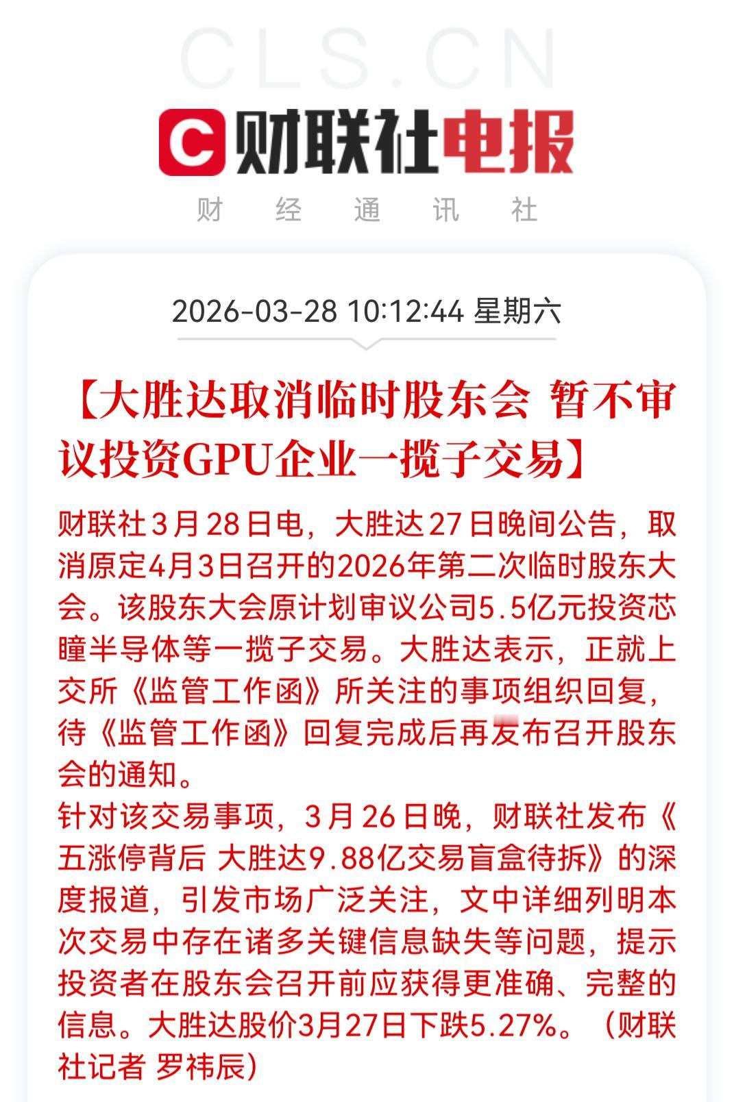 大胜达取消审核投资GPU项目,此前因为投资当前市场最热的GPU项目股价直接拉出5个板,现在一纸公告说要不审核gpu投资企业一揽子交易了!