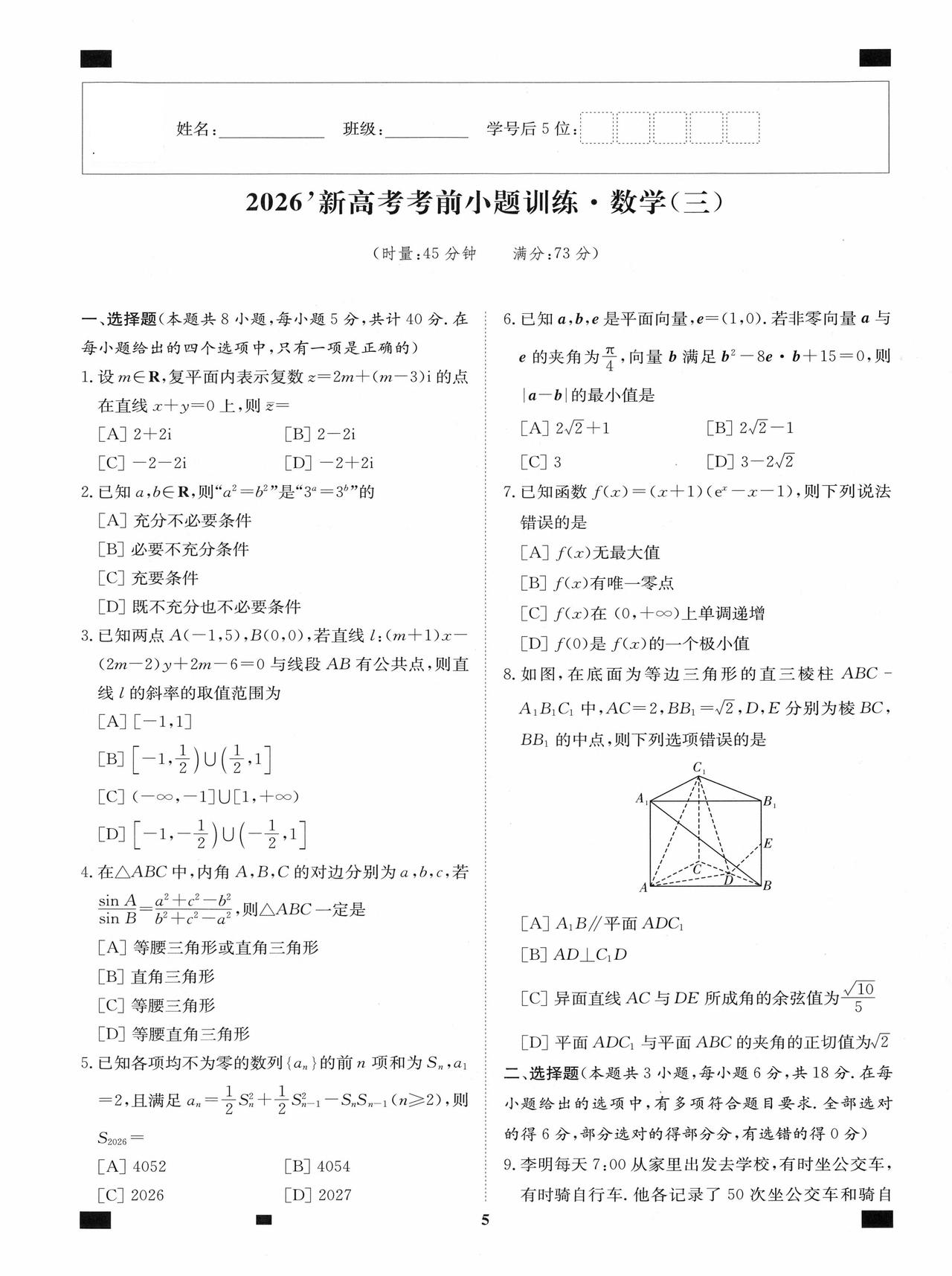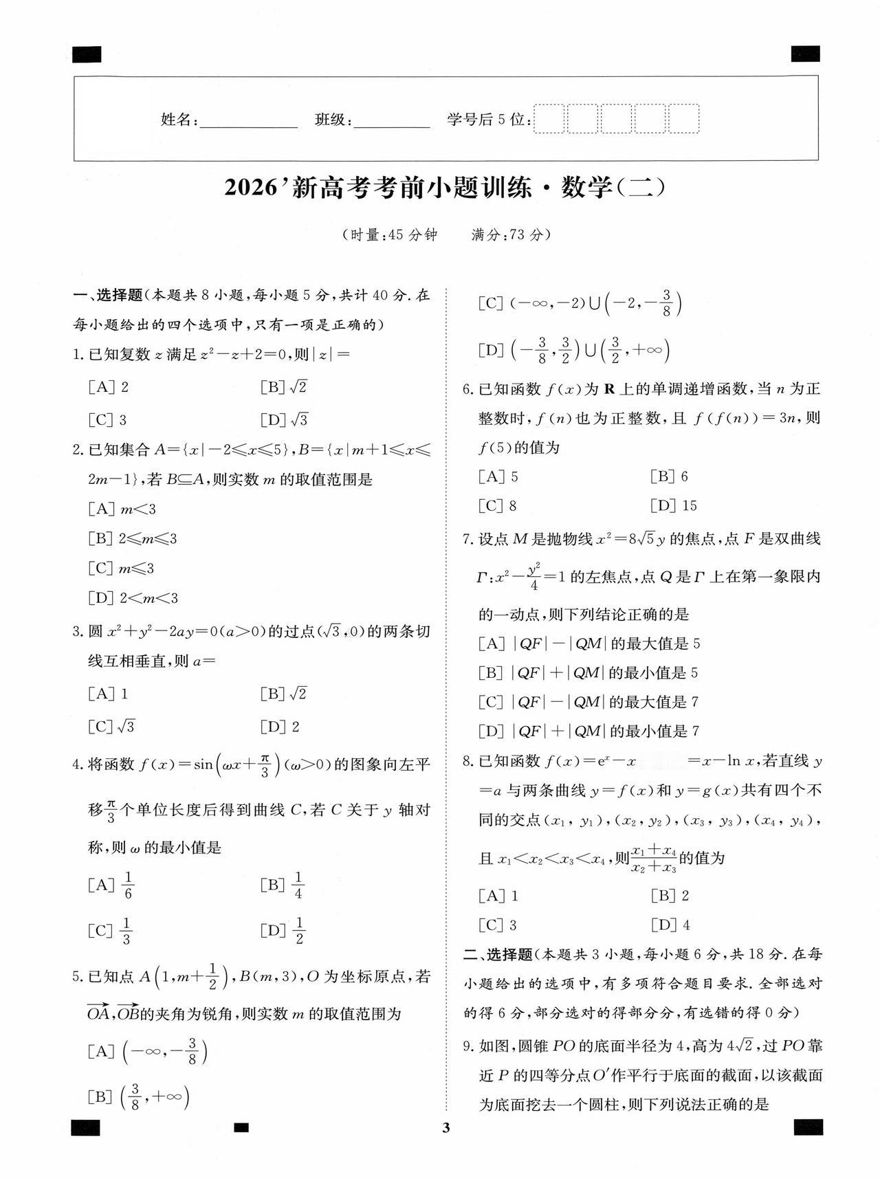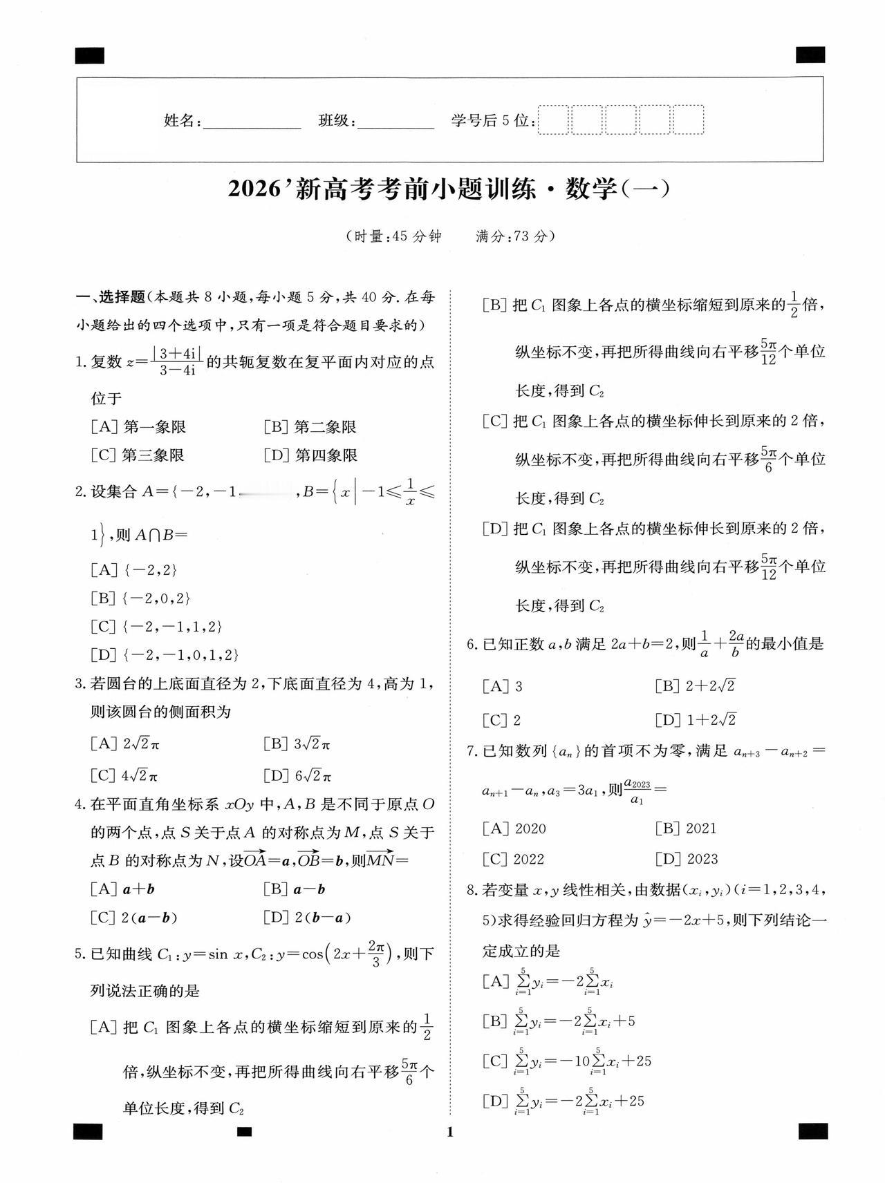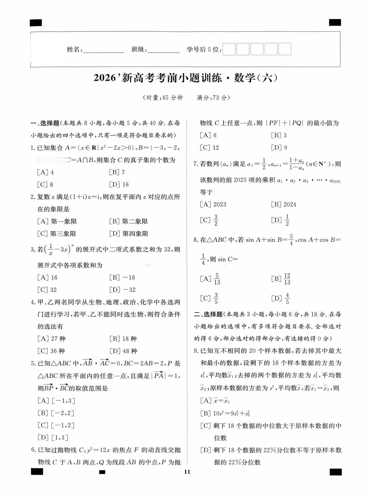 新高考数学——考前12套小题训练题目+答案
