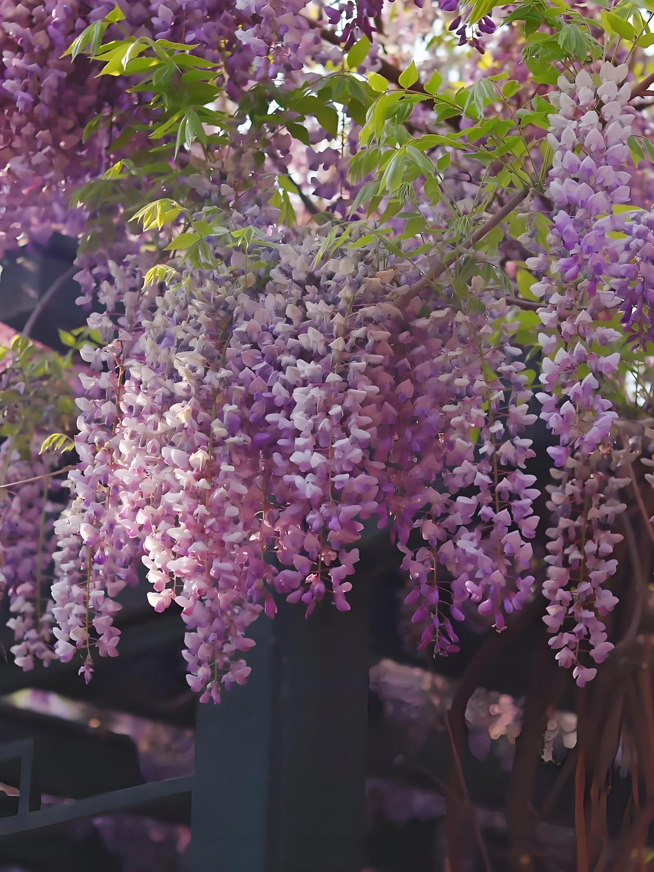 那是种沉静的、向下流淌的紫,在午后的光线里,泛着天鹅绒般的光晕。香气是凉丝丝的,一丝丝、一缕缕,从窗缝里渗进来,不似花香,倒像某种陈年的、清冽的墨香,或是古籍翻开时,那股子沉静的气味。蜜蜂的嗡嗡声也显得醇厚,在这紫色的帷幕间穿行,忙碌得心安理得。这方小小的、垂直的紫色瀑布,将尘嚣都滤净了。我常对着它出神,时光在这里,仿佛被藤蔓缠住了脚,走得格外蹒跚,慢成了影子在花穗上的一寸寸偏移。
